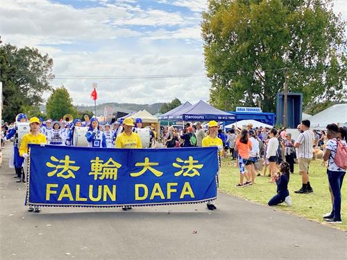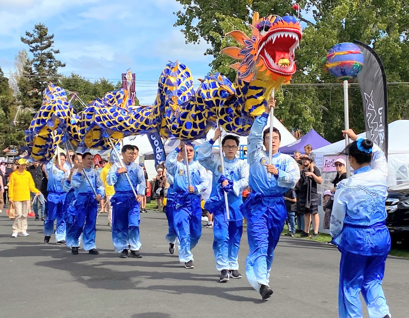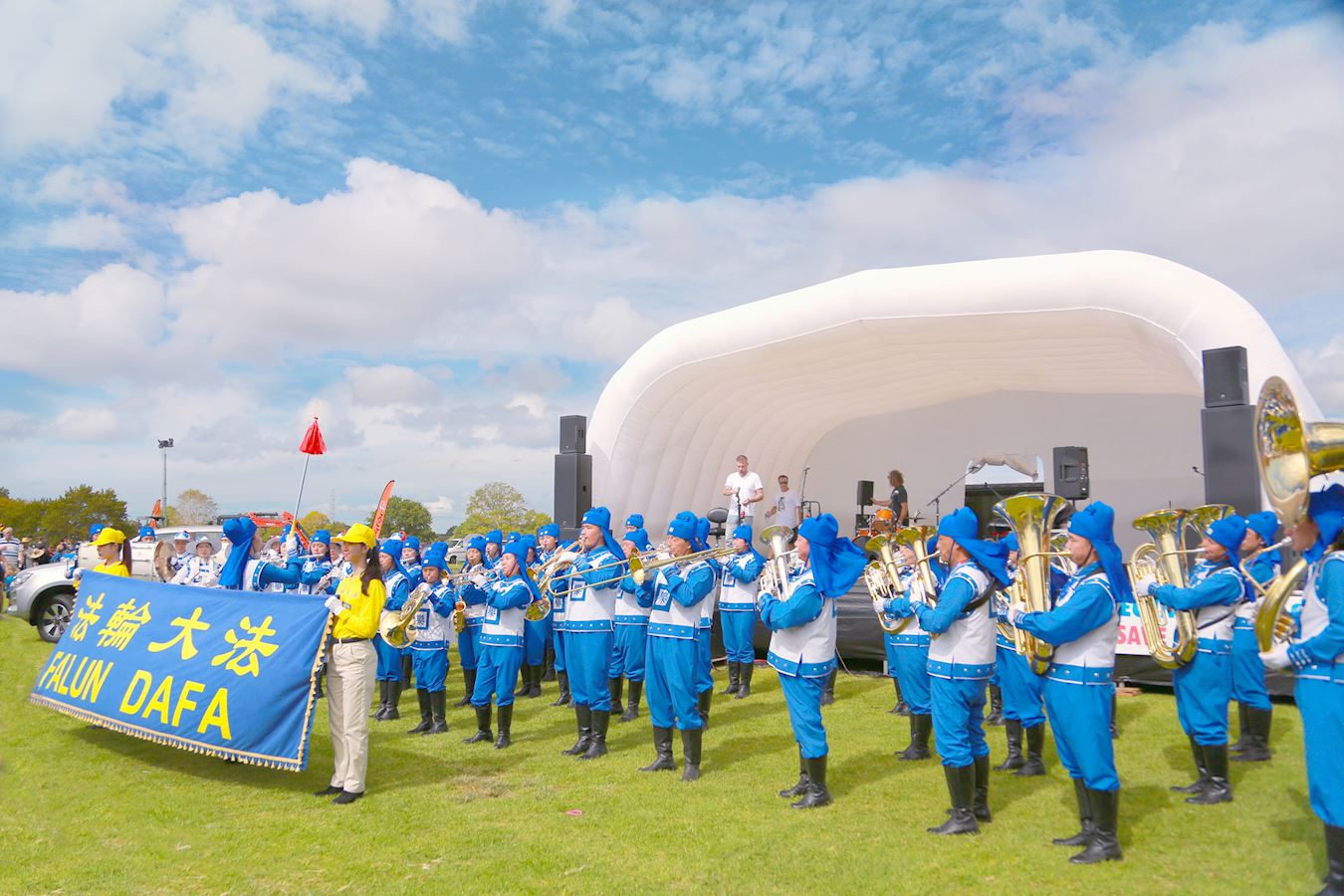 新西兰法轮功学员受邀参加了本次展示会,学员们组成的天国乐团、腰鼓队、舞龙队参加了库姆秀的游行,他们的表演受到了人们的欢迎,孩子们追逐着龙珠和舞龙队互动,十分开心。天国乐团还被邀请到主舞台前表演,法轮功学员借此机会向观众们介绍了法轮功,很多的人们听到后,都来展位了解真相。