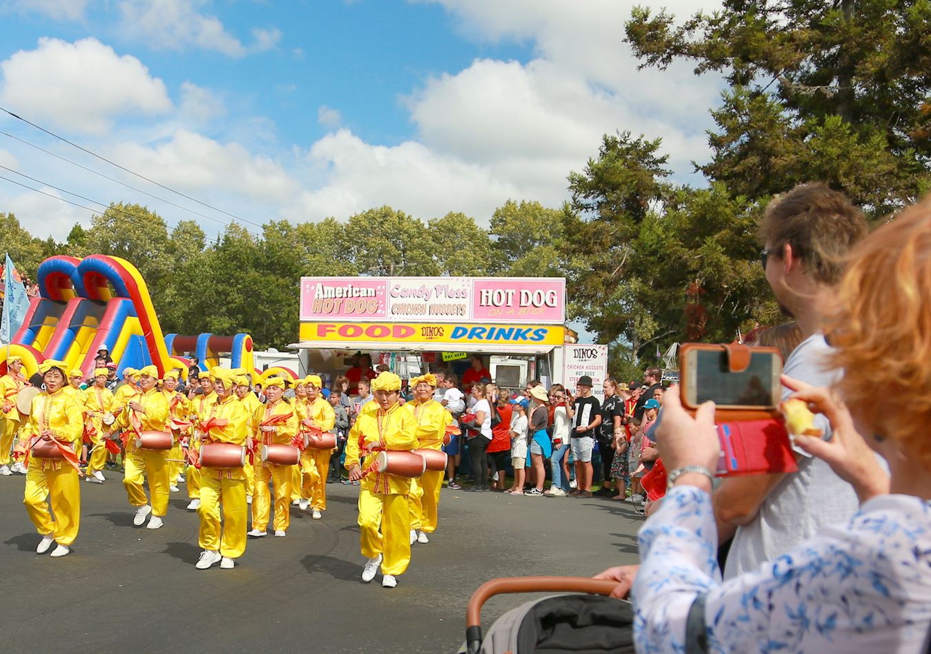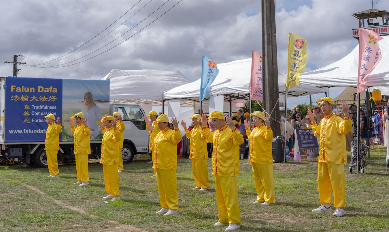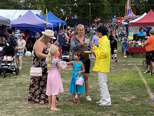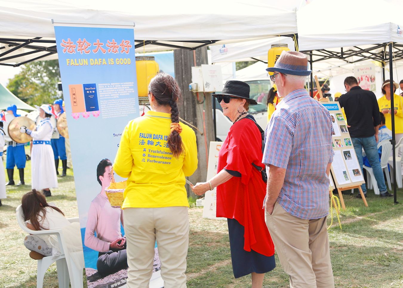 新西兰法轮功学员受邀参加了本次展示会,学员们组成的天国乐团、腰鼓队、舞龙队参加了库姆秀的游行,他们的表演受到了人们的欢迎,孩子们追逐着龙珠和舞龙队互动,十分开心。天国乐团还被邀请到主舞台前表演,法轮功学员借此机会向观众们介绍了法轮功,很多的人们听到后,都来展位了解真相。