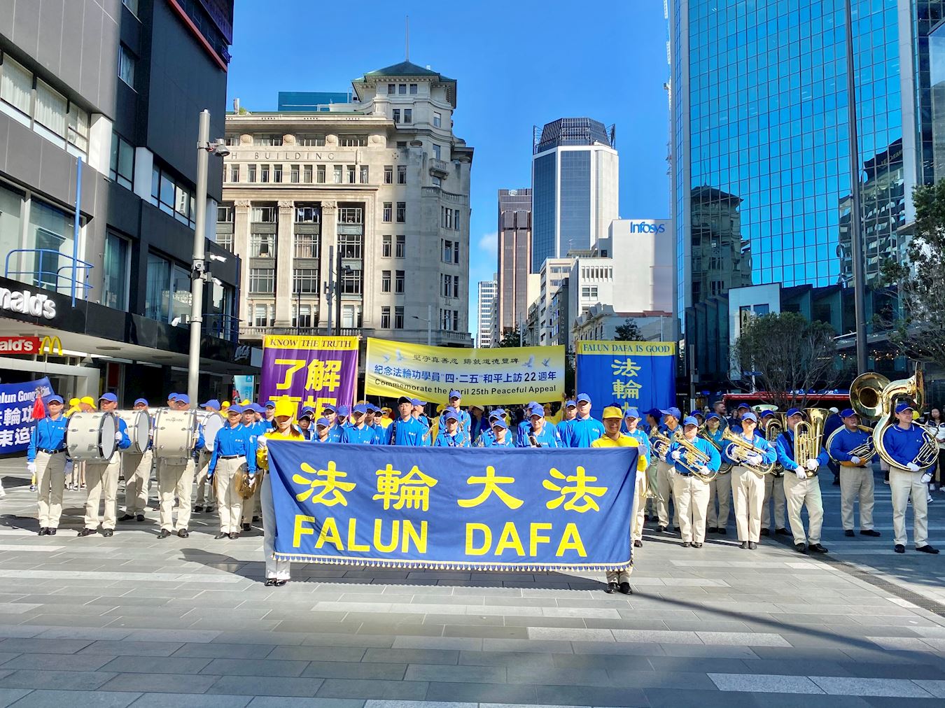 '图1:二零二一年四月十七日,奥克兰法轮功学员们在市中心伊丽莎白广场举办“纪念四二五和平上访二十二周年”集会。'