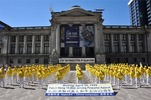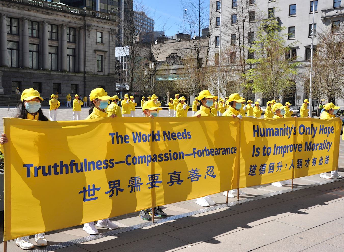 当天的温哥华,天气晴朗,气候宜人。法轮功学员集体炼功的祥和场面吸引着人们的注意,过往车辆也频频鸣笛致意。