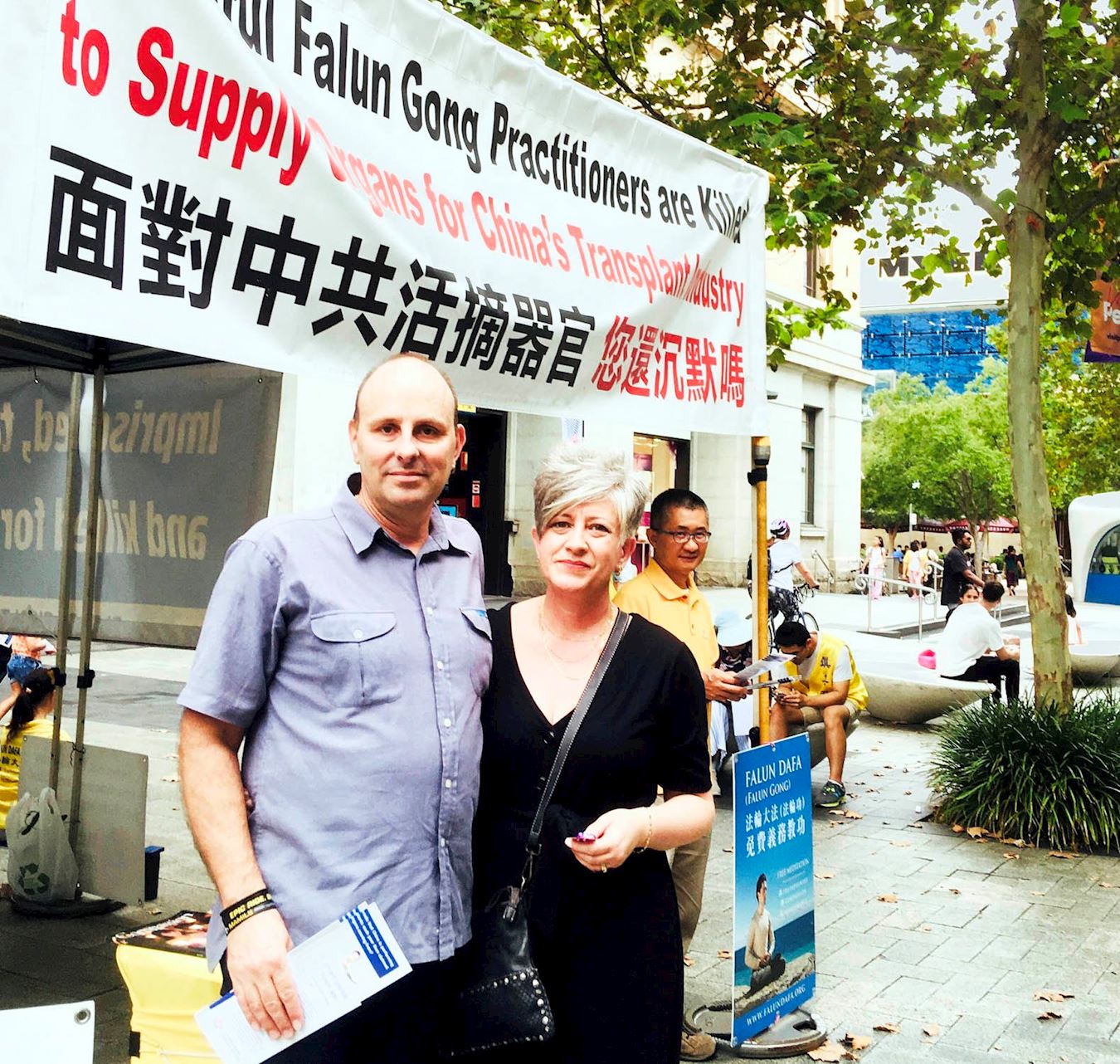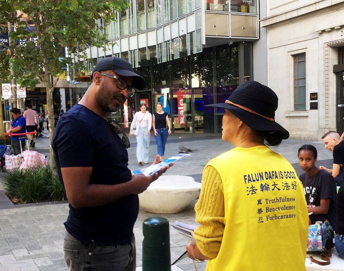 来到默里街购物中心的人们,远远的就能看到法轮功真相展位上的几条横幅——“面对中共活摘器官,你还沉默吗”、“制止中共活摘法轮功学员器官”。走近展位,人们听到祥和的法轮功炼功音乐的同时,还能看到学员展示法轮功优雅缓慢的五套功法。过往路人有的驻足观看;有的拿取资料、传单,聆听真相;有的在征签表上签字,他们希望一起抵制中共对法轮功的迫害,早日结束这场浩劫。