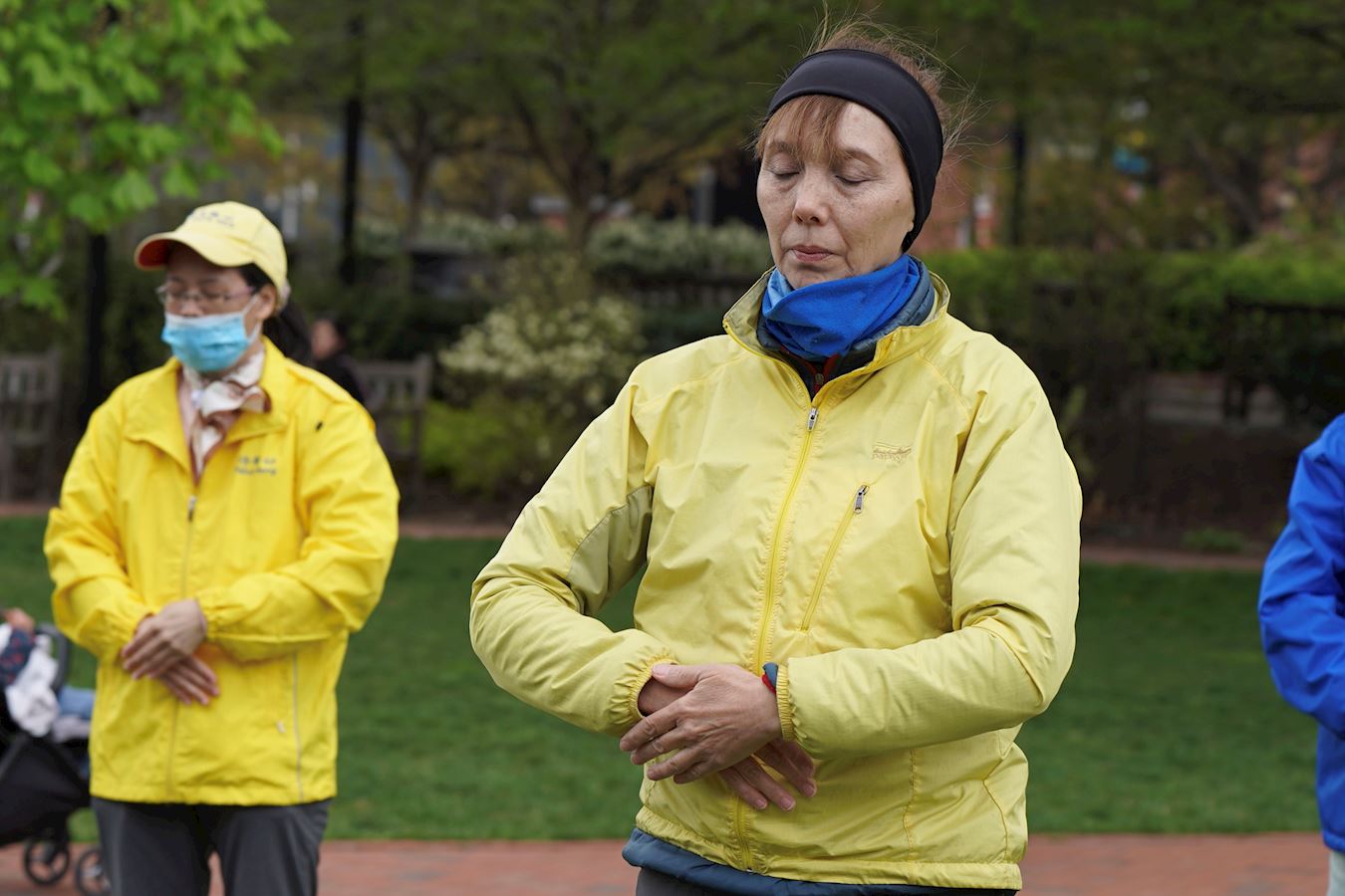 图5:西人法轮功学员泰瑞(Terri Morse)在炼功。