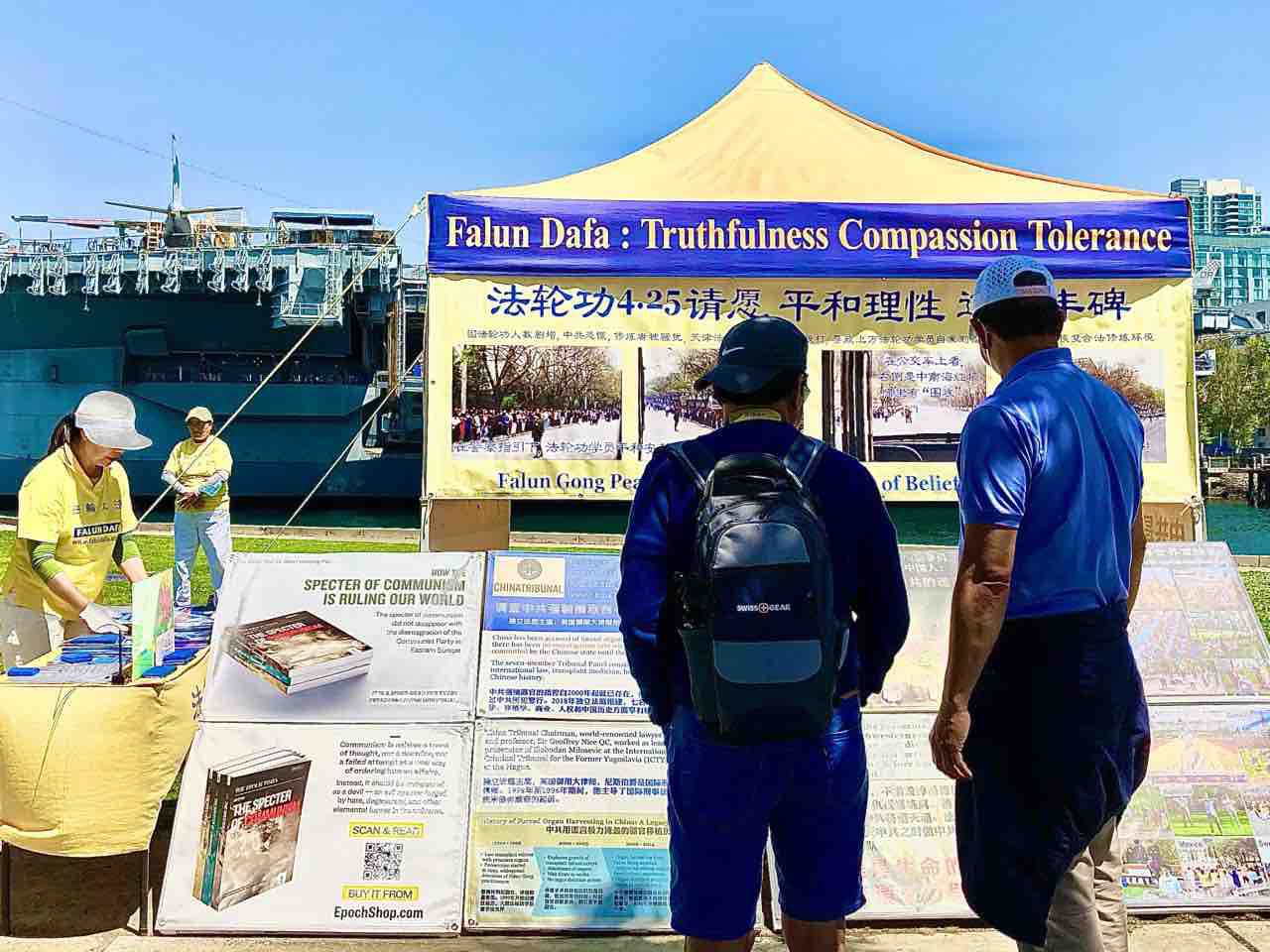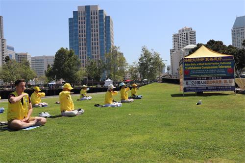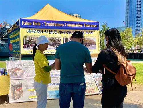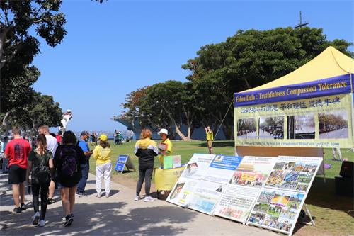 四月的圣地亚哥,阳光和煦,微风宜人,来往许多游客看着法轮功学员祥和的功法展示,不禁上前询问这是什么活动。