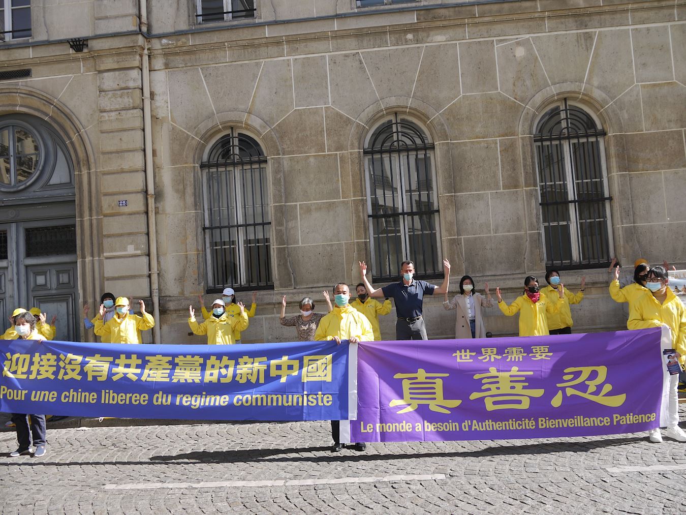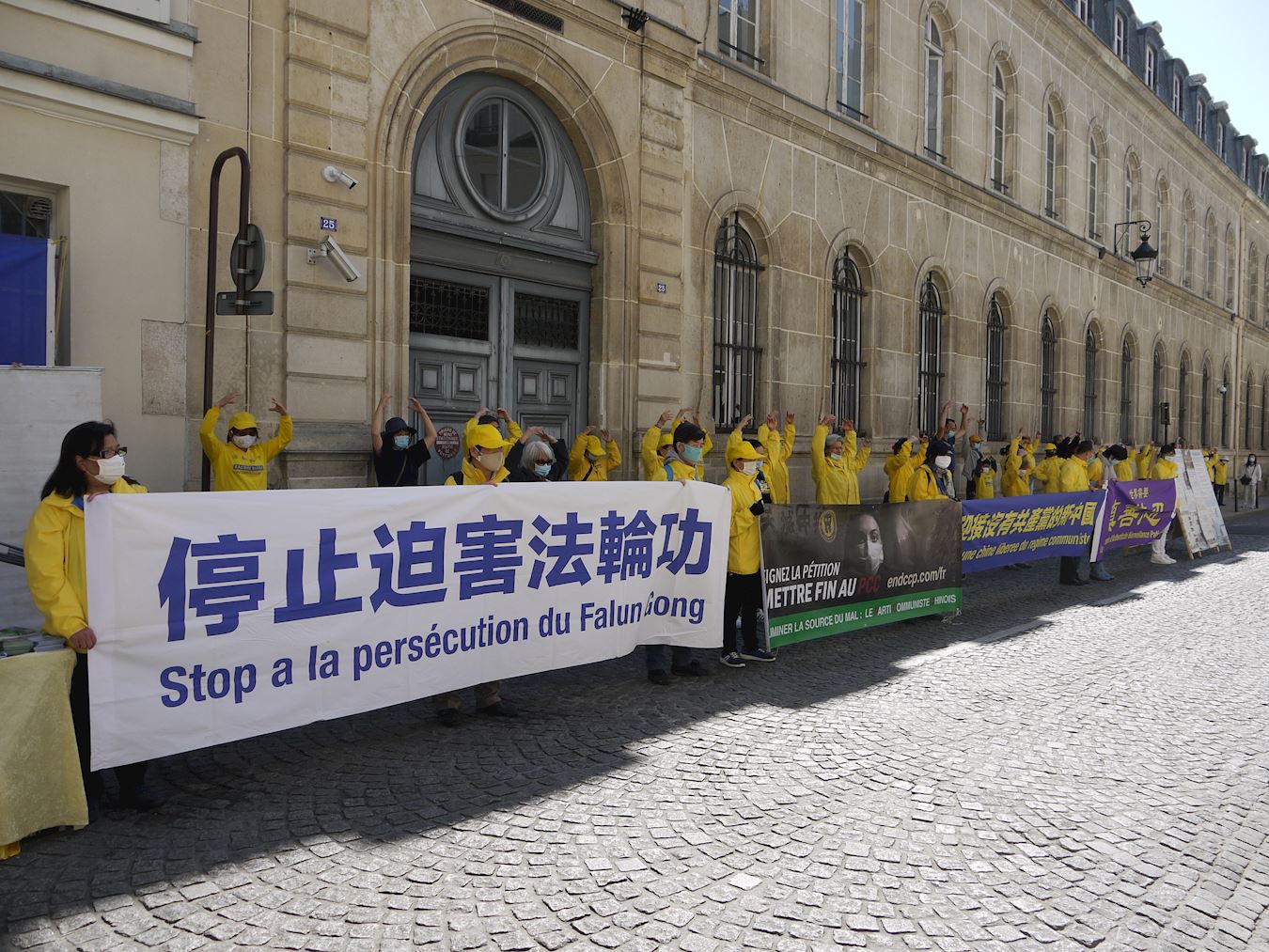 为了纪念这个日子,秉承四二五精神,巴黎法轮功学员于二零二一年四月二十三日下午在巴黎中使馆前举行集会,告诉人们法轮功的真相,揭露中共二十多年来对法轮功的残酷迫害,同时向民众征集签名制止迫害。