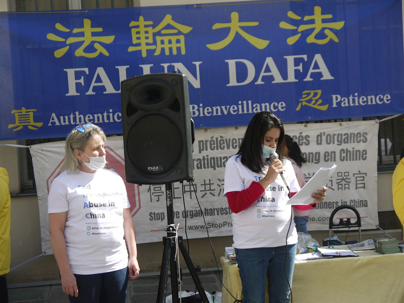 ![]() 图4:结束中国滥用移植器官协会法国代表吕纳(Fiorella Luna)女士(右)在集会上谴责中共活摘法轮功学员器官牟取暴利。 |