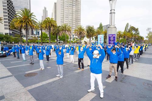 上午九点十分,法轮功学员首先集体炼功。祥和的炼功场面吸引人们驻足观看,有的民众称赞法轮功的炼功场面非常平和,他们喜欢法轮功真、善、忍的原则。
