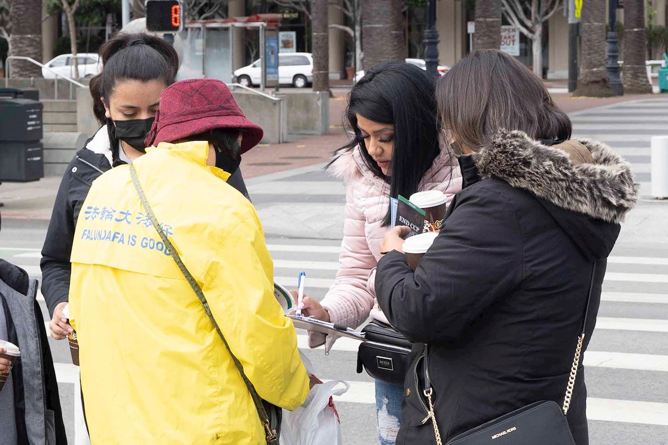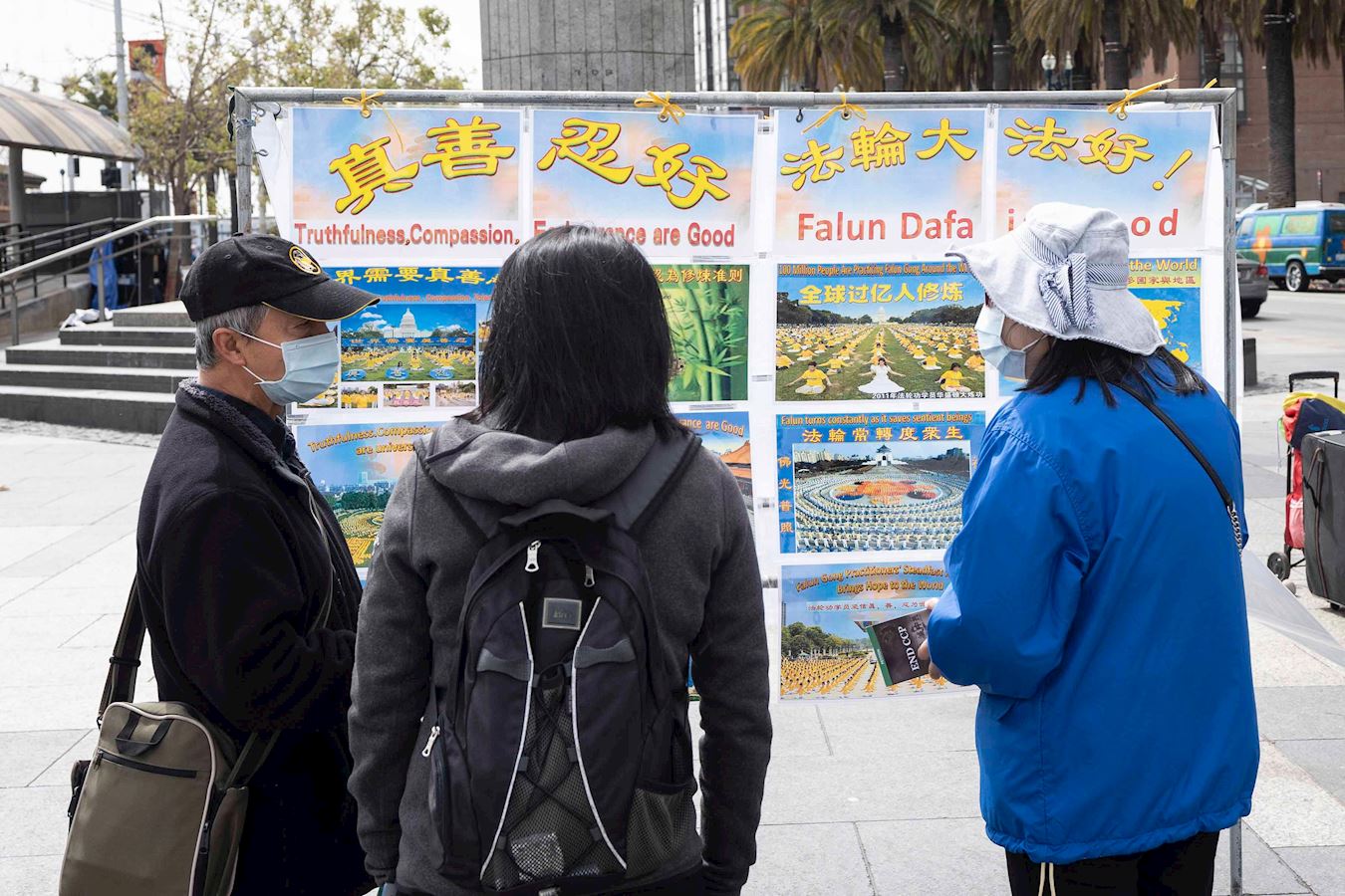 从南加州来旧金山旅游的安娜﹒盖尔(Ana Gere)首次听说法轮功在中国受迫害,她对中国人因没有信仰自由而遭受迫害感到震惊。当“四二五”集会开始,天国乐团开始演奏乐曲,盖尔女士感慨得泪流满面,她表示,“音乐是如此的美,他们是如此的善良美丽,我对那些受迫害的法轮功学员感到非常的悲伤,我没有办法接受,令人不解为什么中共要迫害这群想做一个更好的人的修炼团体?”