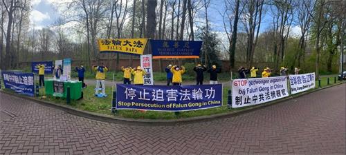 在中共大使馆的另一侧,悬挂着两幅大型真相展板,“法轮大法洪传全世界”和“制止迫害法轮功”。六位法轮功学员在这里进行抗议活动。向中共大使馆宣读了《致中国驻荷兰大使馆全体工作人员》的一封信,回顾了二十二年前四·二五法轮功和平抗议的历史意义,揭露中共迫害法轮功的罪恶事实,呼吁使馆内的中国同胞早日觉醒,早日三退,唾弃中共,为自己选择美好而光明的未来。荷兰法轮大法学会呼吁:停止迫害法轮功、停止活摘器官!法办江泽民!释放所有的大法弟子!”