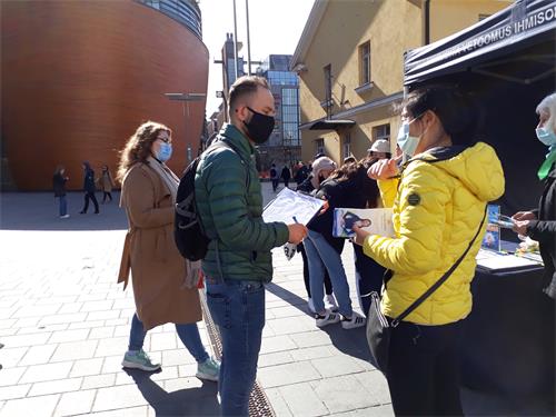 在医院工作的爱沙尼亚人弗雷德(Fred)和他的朋友科特(Keit)跟学员聊了起来。“中共就是一个独裁统治国家,做了非常多的坏事。”科特问:“你们需要多少的签名?”学员回答道:“我们已经征签了20多年,希望越多越好,直到迫害结束。”他恍然大悟道:“我知道了,就是让更多的人知道迫害。”