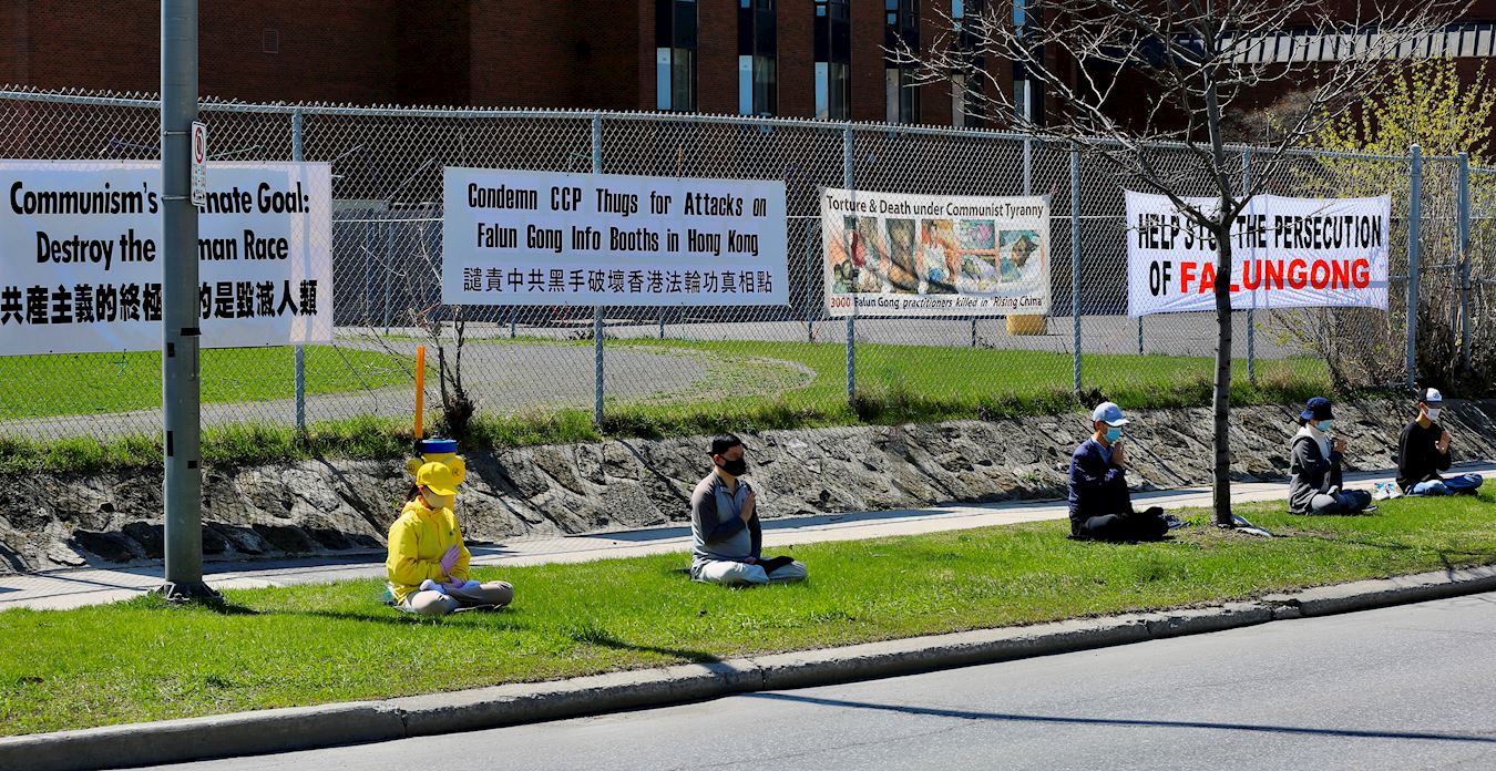 因为疫情,加拿大安大略省实行居家令,户外集会限制最多五个人参加。当天,来自曾经遭受迫害的两个家庭的五名法轮功学员代表渥太华全体法轮功学员在中使馆前讲述了二十二年前的四二五的真相。