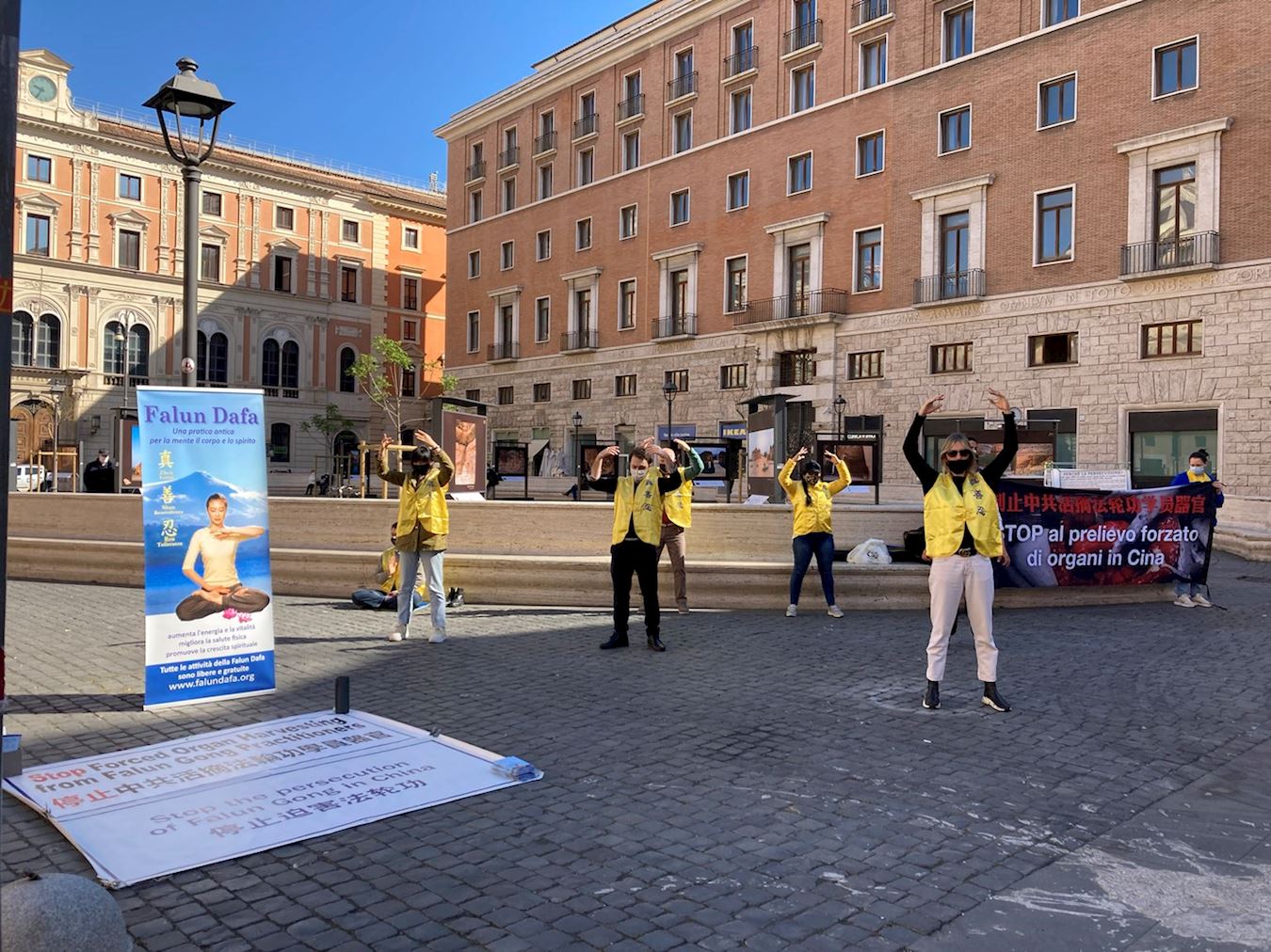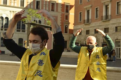 图1~2:罗马法轮功学员在罗马市圣西尔维斯特广场(Piazza San Silvestro)举行炼功、讲真相活动