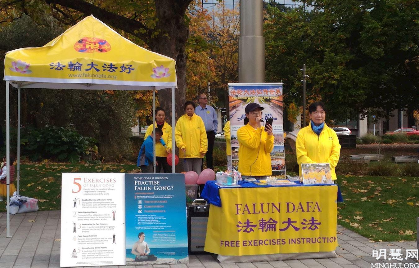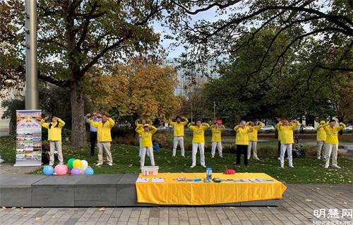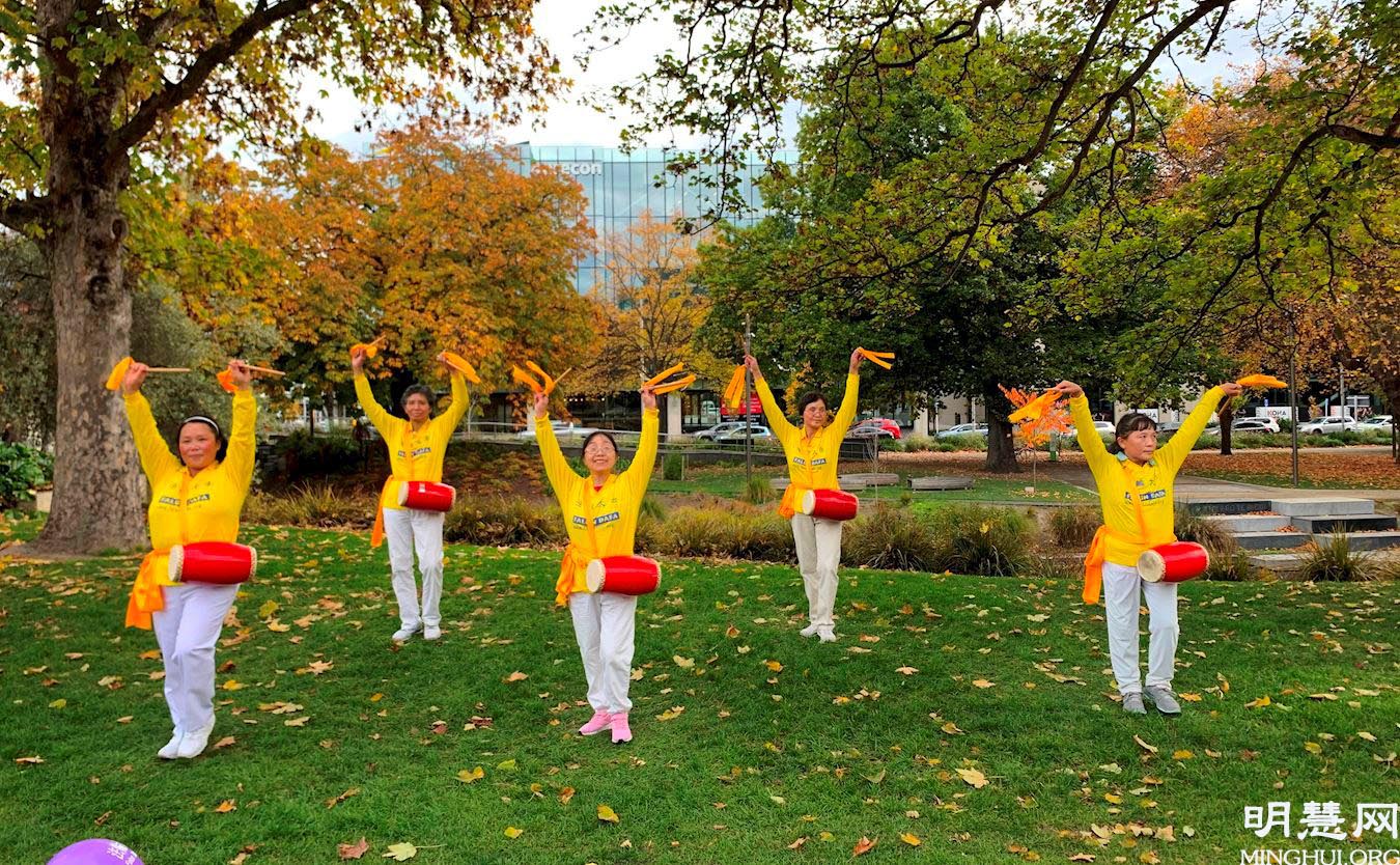 集会现场,法轮功学员向当地居民展示法轮大法功法,介绍了他们在大法修炼中受益的真实故事,优美欢快的中国传统腰鼓表达了法轮功学员的喜悦心情。活动现场引来许多市民驻足观看、拍照,还有当地自媒体人前来制作视频,准备上传至社交媒体。