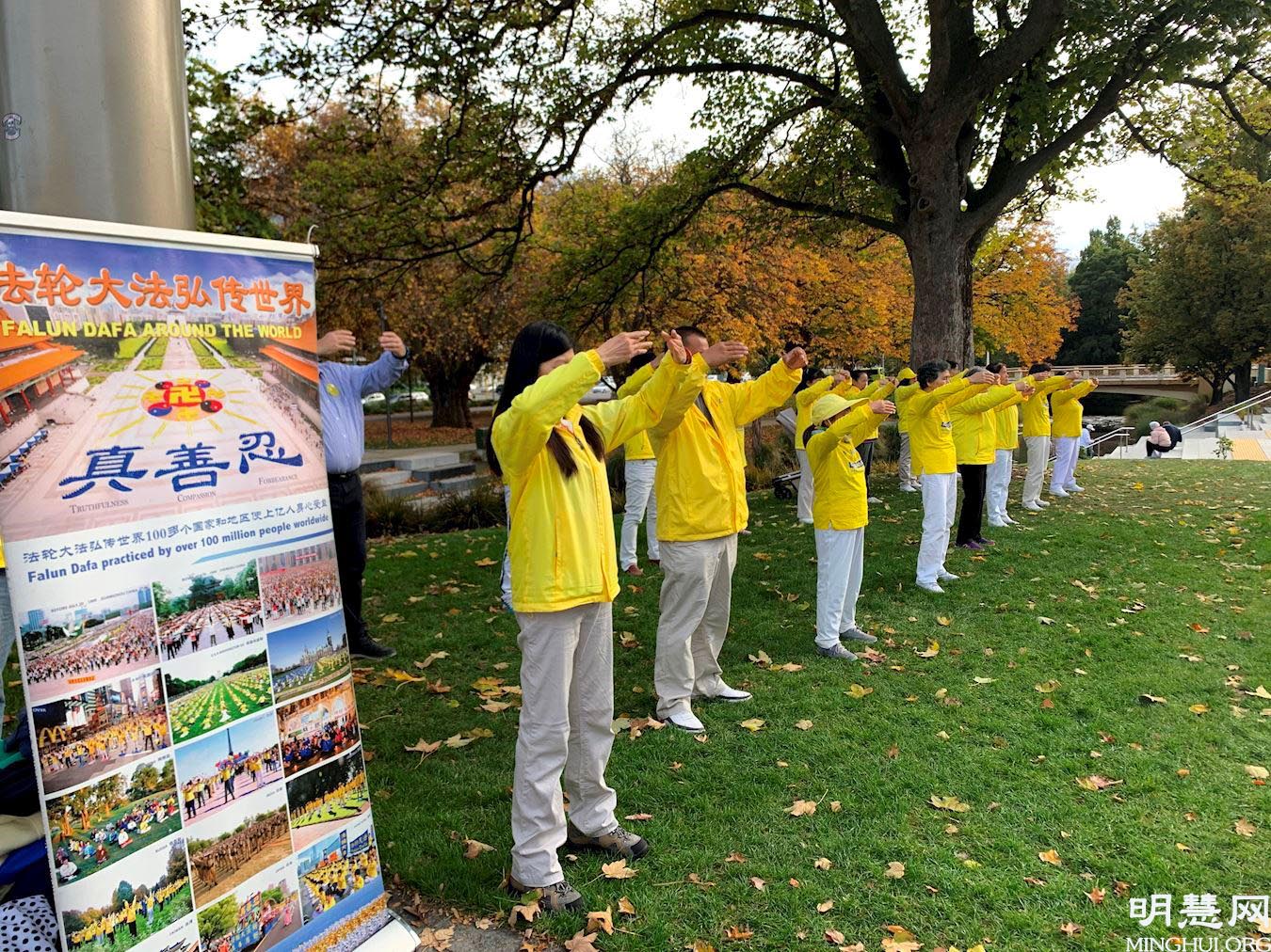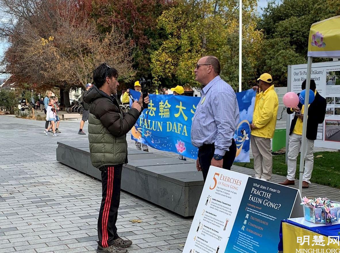 一位当地中年男子被法轮功学员平和优雅的炼功场面所吸引,他说这个炼功场充满了正能量。当他了解法轮大法弘传世界,而在中国大陆被中共迫害的真相后,立即在征签表上签名,并表示一定不能让邪恶的共产主义把自由民主的新西兰毁掉。他向学员要了关于中共活摘器官牟利的真相资料,准备回去后仔细了解相关信息。