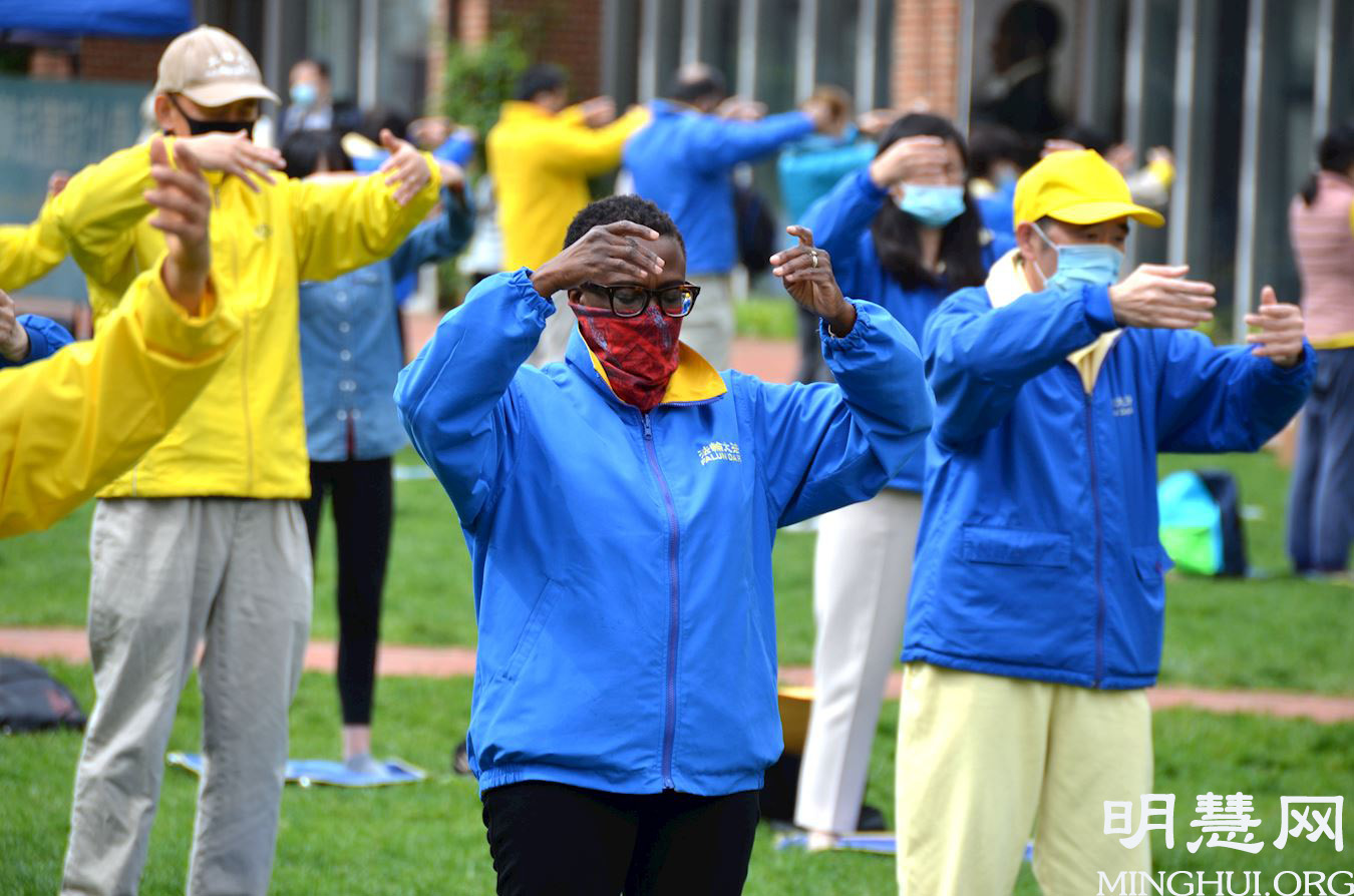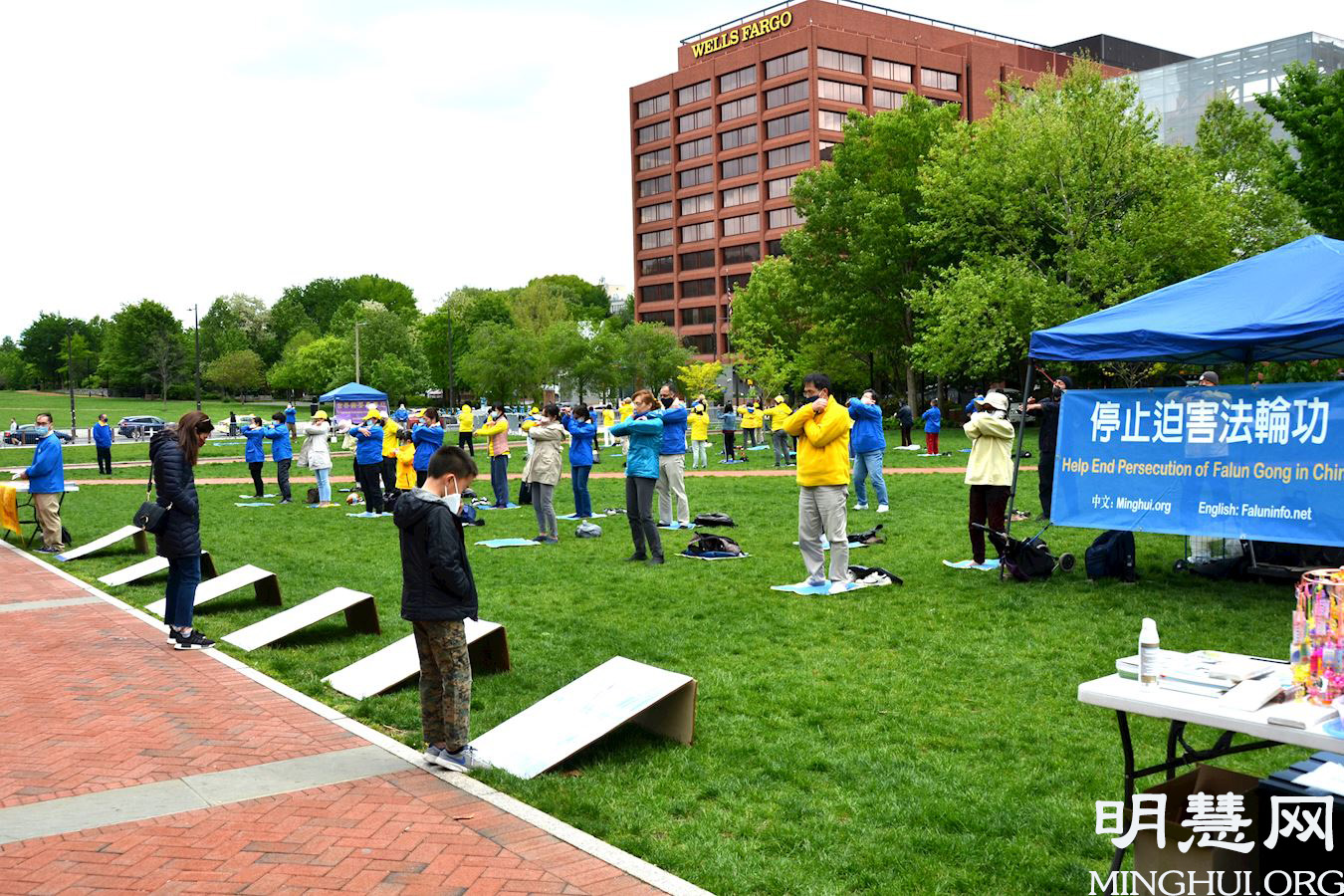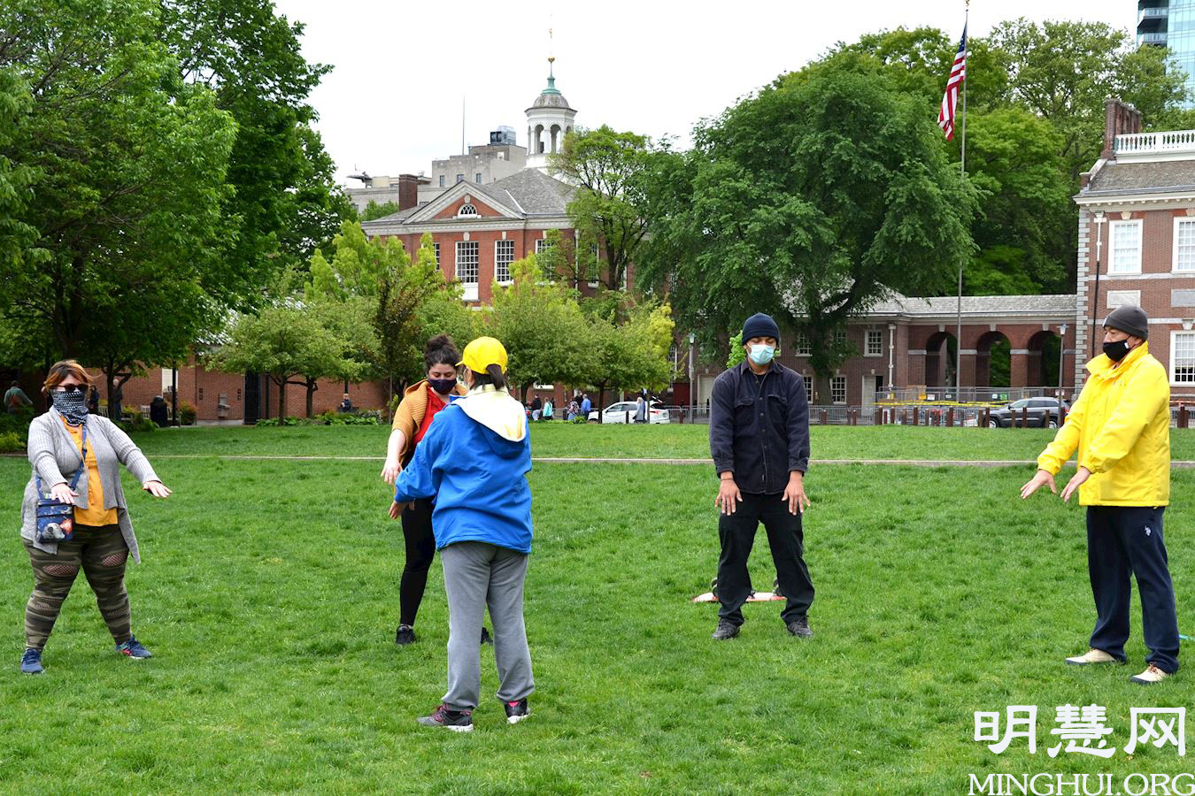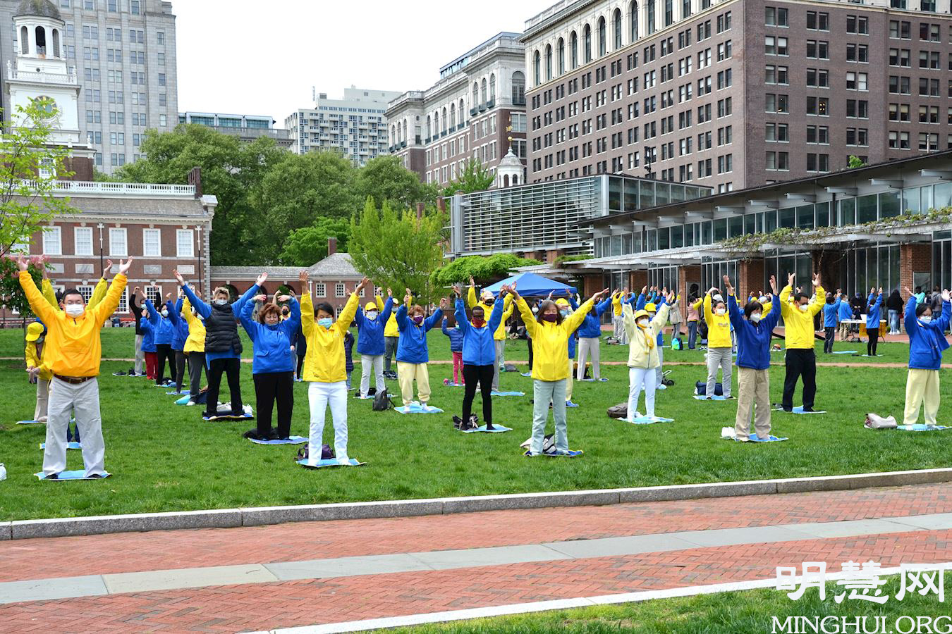 '图1~2:二零二一五月八日,大费城地区法轮功学员在美国国家独立历史公园的费城自由钟广场集会,庆祝五月十三日的世界法轮大法日。'
