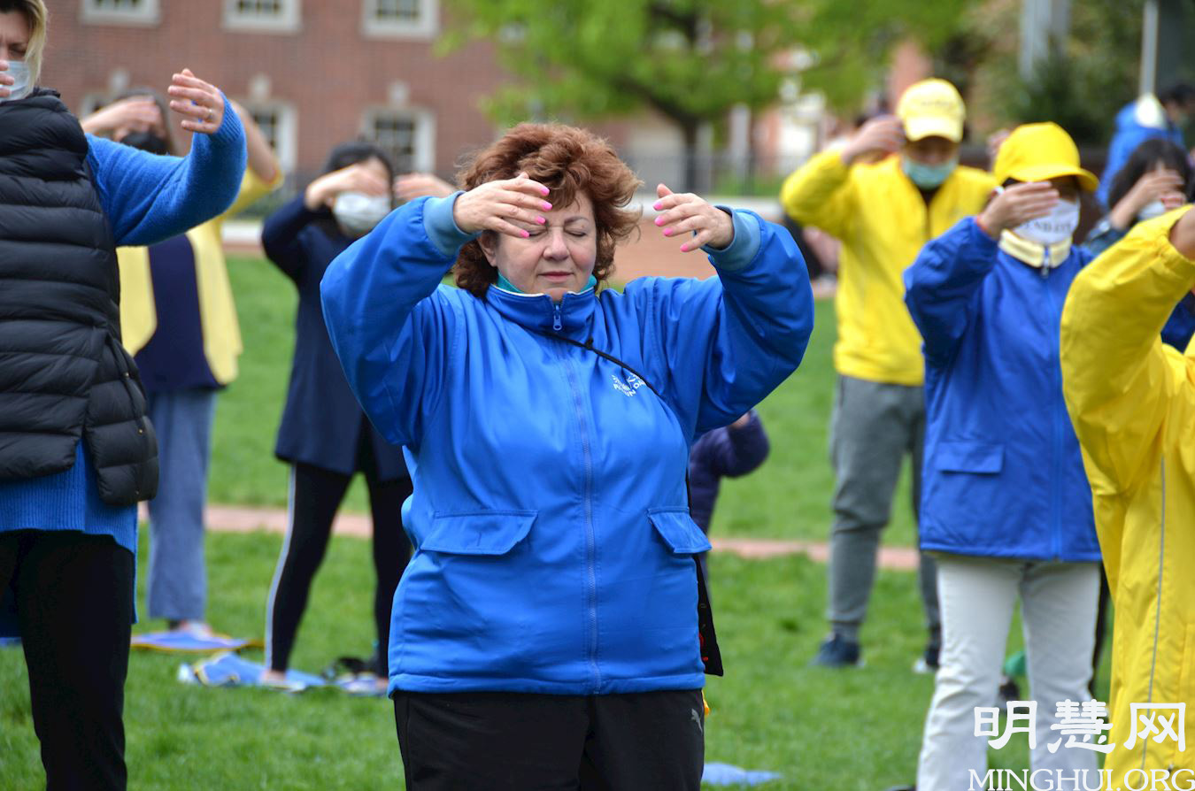 法轮功学员的集会吸引了众多游客了解法轮功真相。来自宾州Lackawaxen的Amanda说,她很悲哀中国人在他们自己的国家不能自由地拥有信仰。她觉得法轮功功法很优美,“我在这里感到了平和的能量,一种非常祥和的能量。”