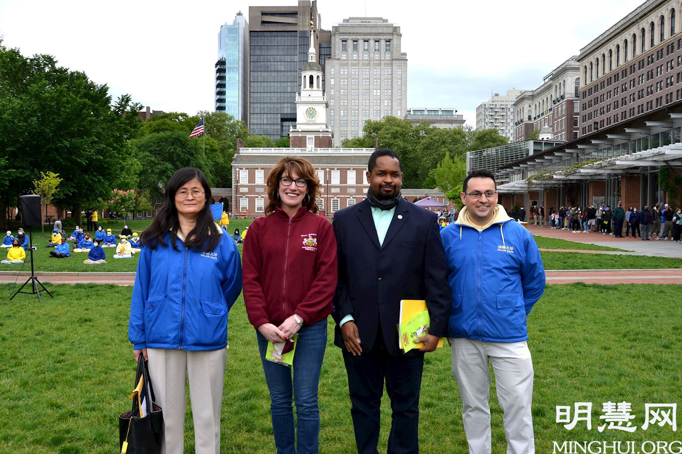 图6:宾州州参议员Sharif Street(右二)和宾州州众议员Mary Isaacson(左二),分别代表宾州参众两院到集会现场颁发给法轮大法的褒奖状。