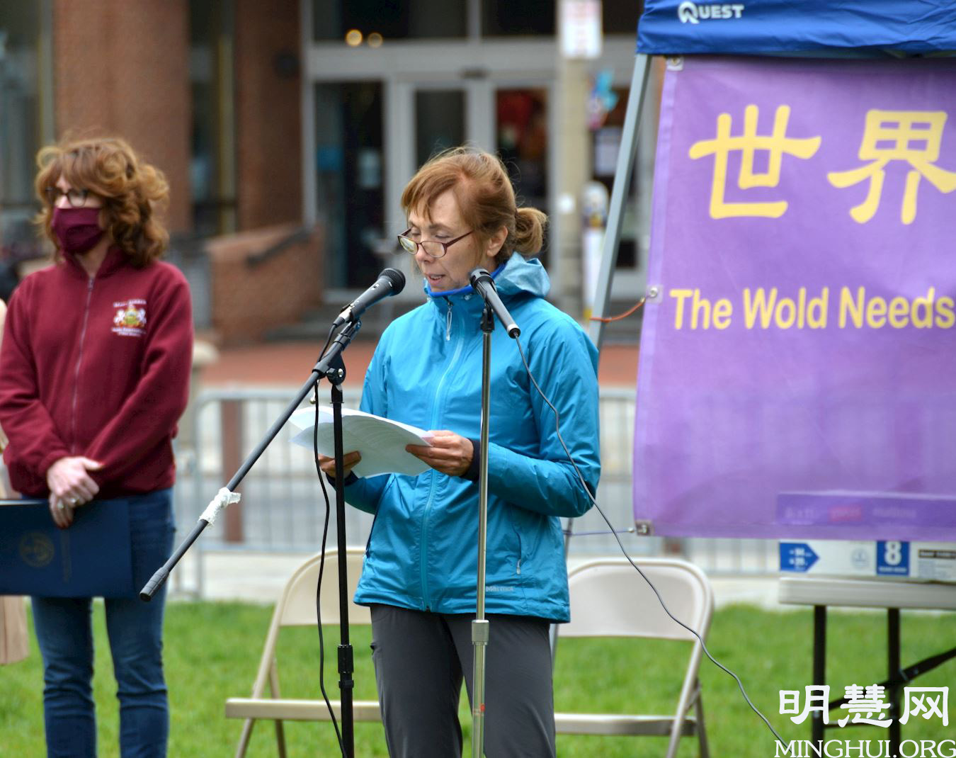 '图7:法轮功学员Terri Morse在集会上发言,感恩法轮大法带给的身心健康,道德提升。'