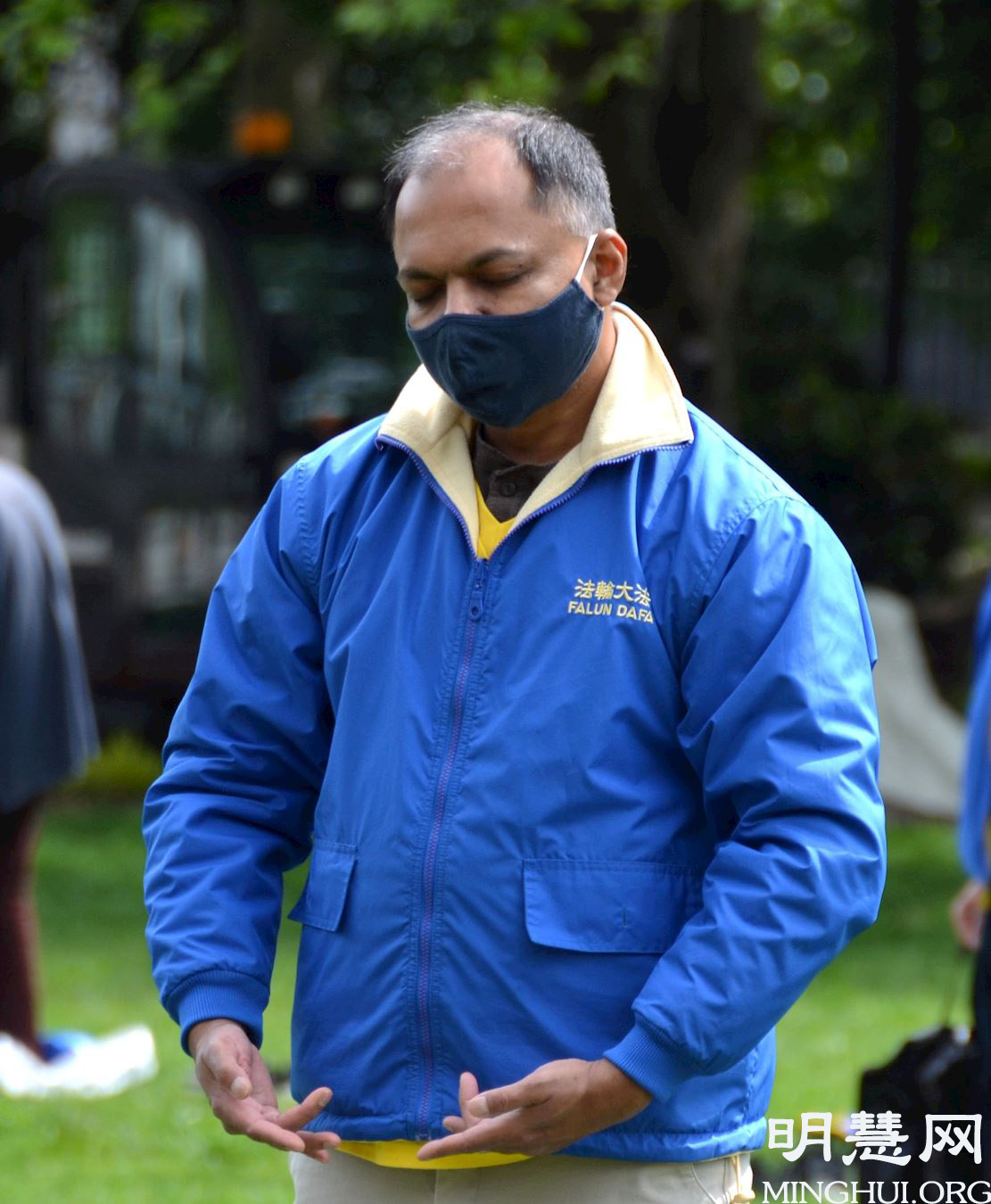 图8:法轮功学员Santhosh Krishnamurthy在集会上炼功。