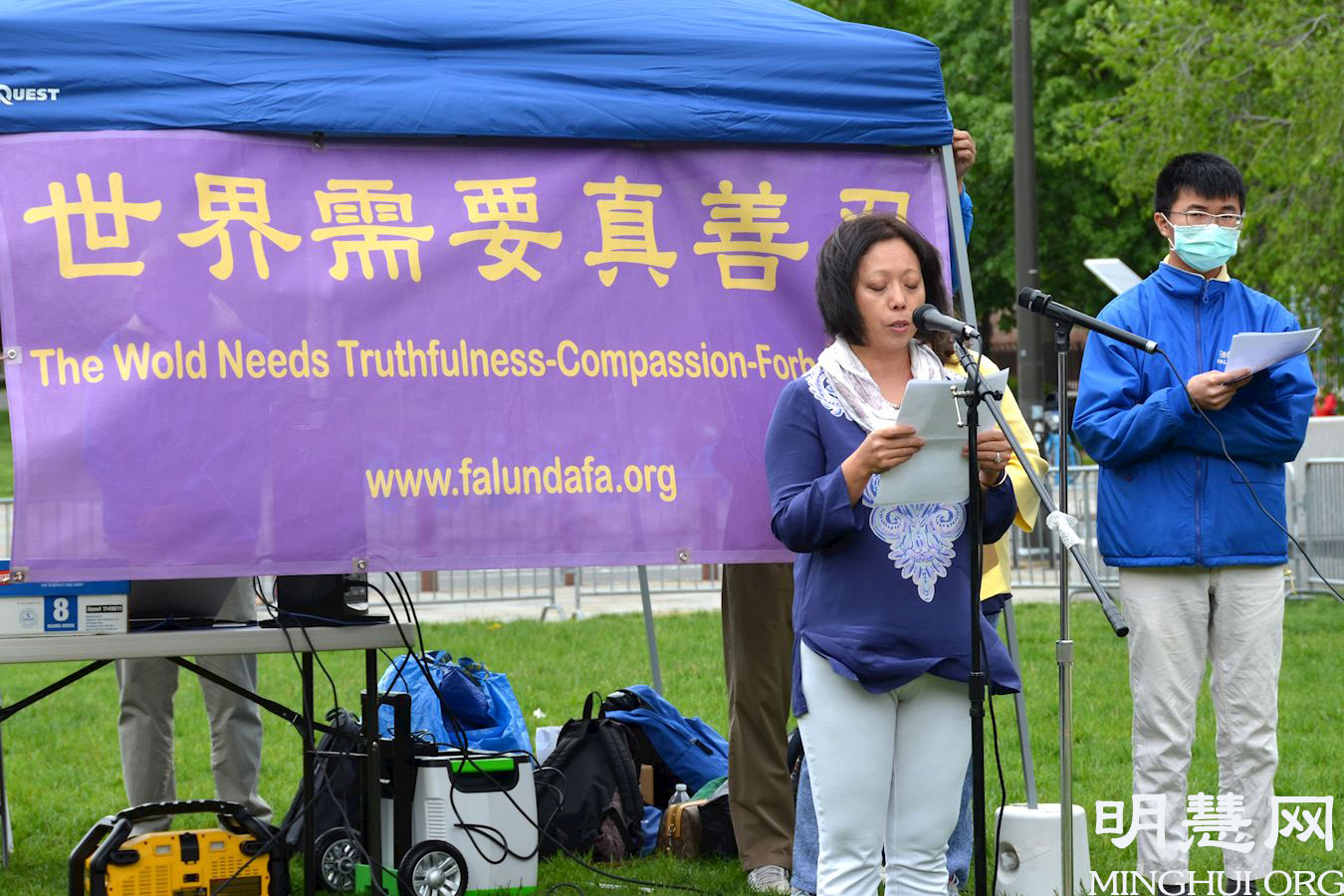 图9:法轮功学员辛迪·刘在集会上发言,感恩法轮大法带给的身心健康,道德提升。