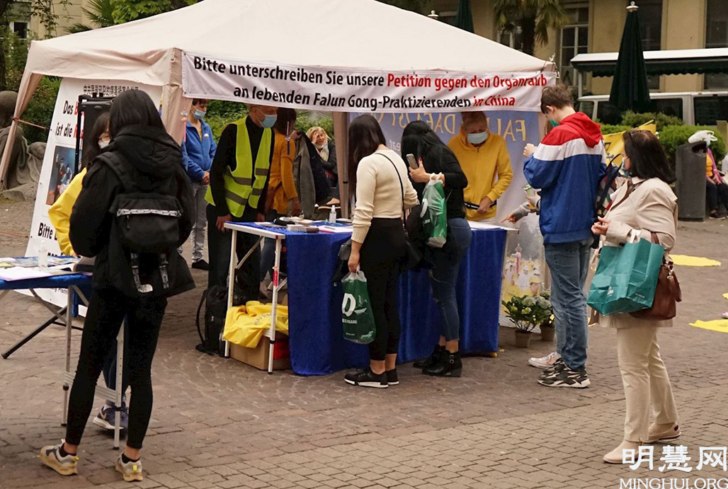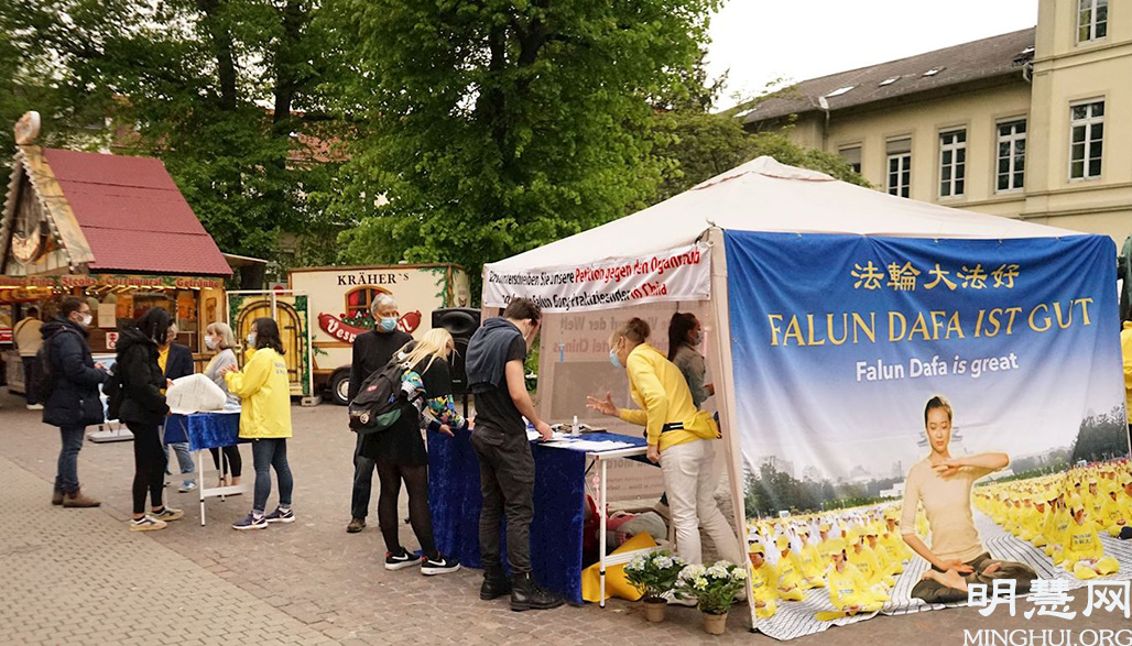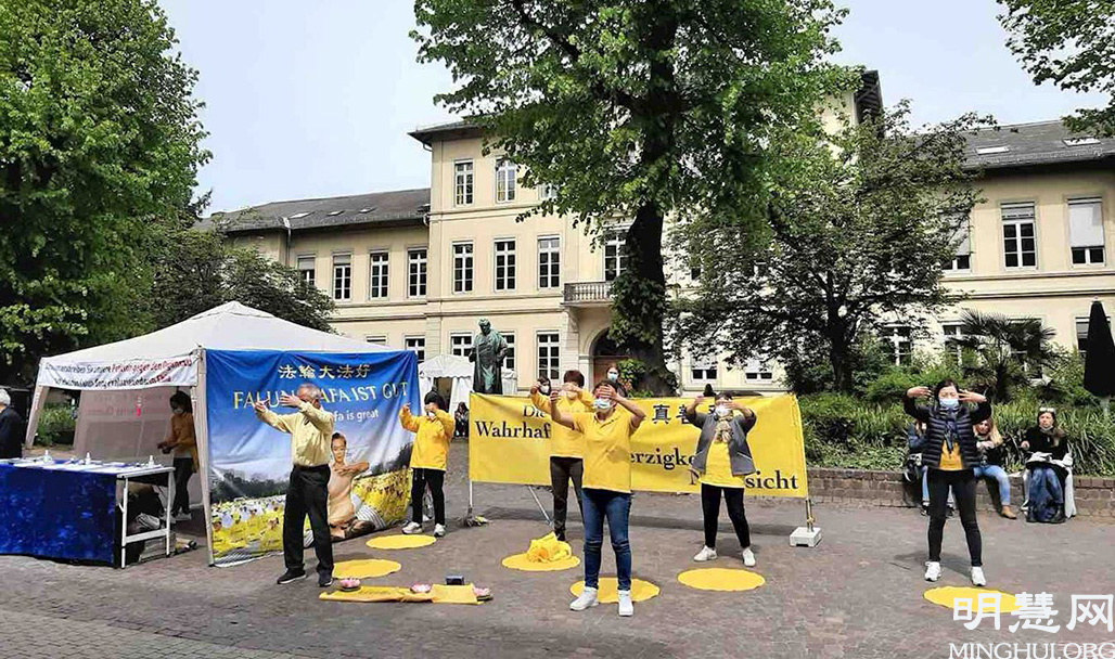 ![]() 图2:二零二一年五月八日,法轮功学员在海德堡的本生广场(Bunsenplatz) ,庆祝世界法轮大法日。 |