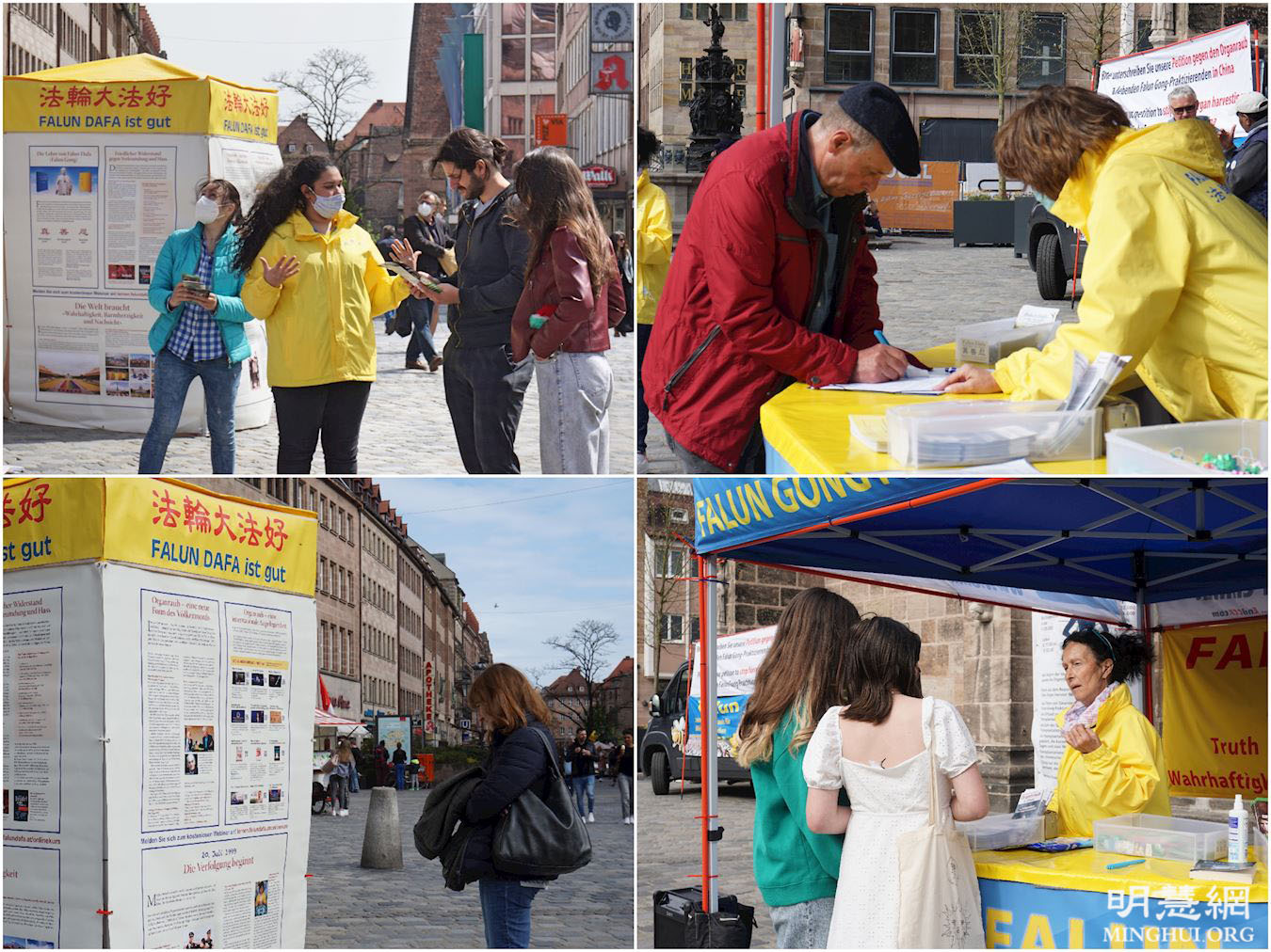 ![]() 图2:在“五一三”世界法轮大法日来临之际,二零二一年五月八日,德国巴伐利亚州弗兰肯地区法轮功学员纽伦堡市中心步行街的洛伦兹教堂前传播法轮功的真相,同时向民众征集签名制止迫害。 |