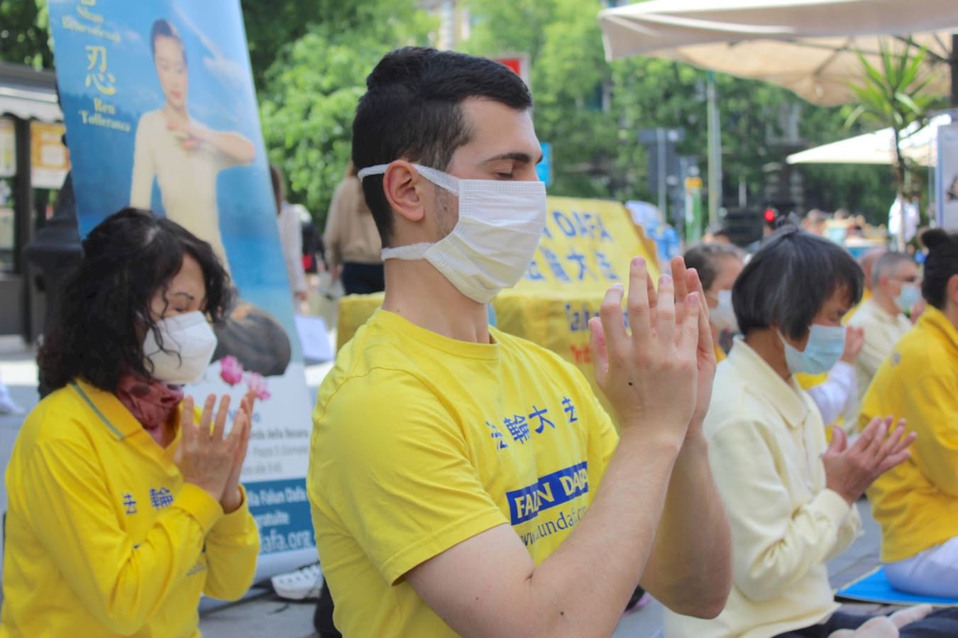 当日天空晴朗,学员的庆祝活动吸引了人们的目光。许多路人和游客都停下脚步,好奇的观看着学员展示功法。在米兰市中心的喧嚣声中,汽车和人声嘈杂声中,这群祥和的穿着黄色服装的学员更显得脱颖而出。