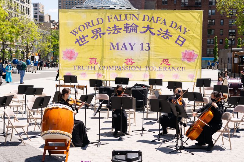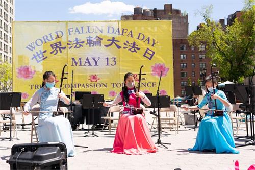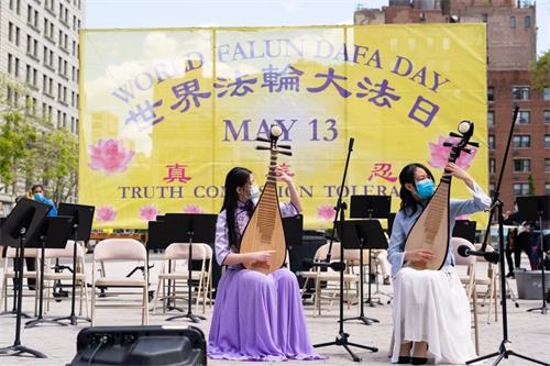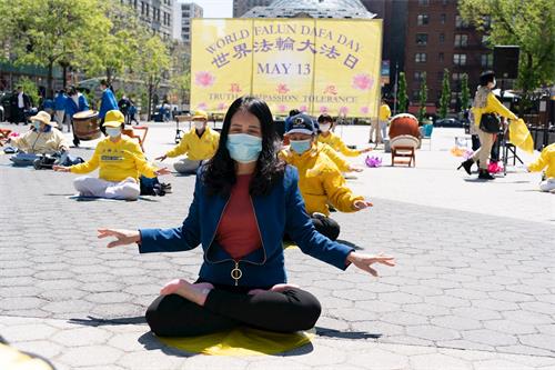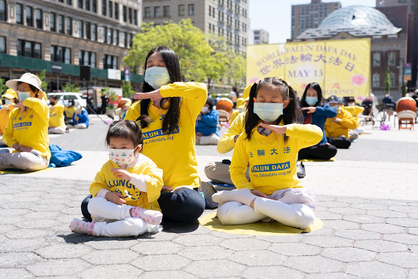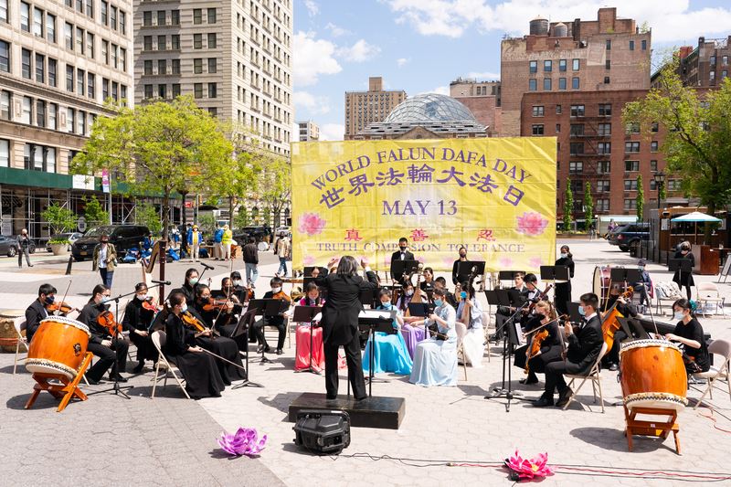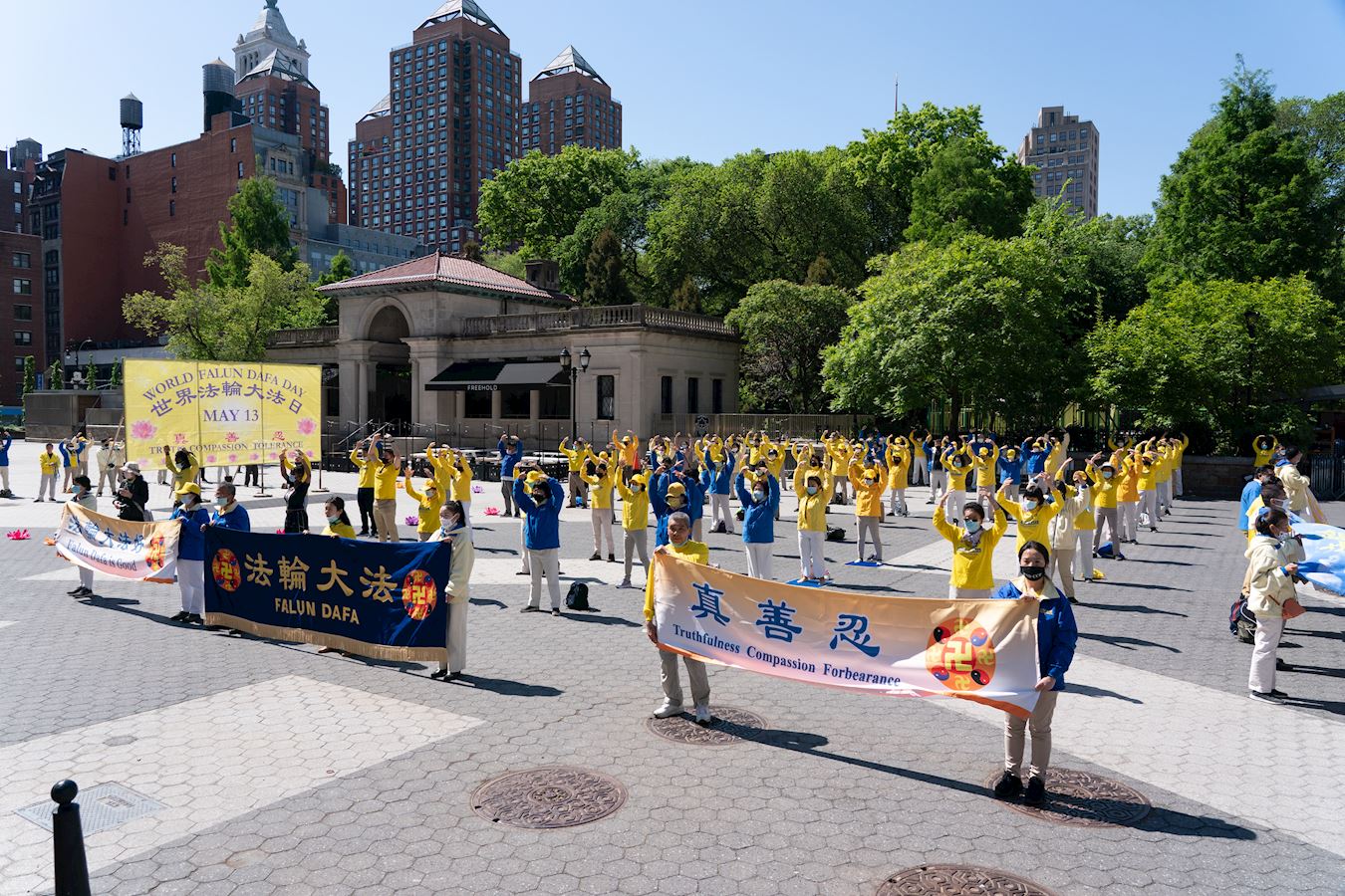 【明慧网二零二一年五月十三日】二零二一年五月十一日,纽约市下城的地标建筑——联合广场上,“世界法轮大法日”的大横幅美丽又醒目,前面是中英文“法轮大法好”,“真善忍好”的横幅,广场上乐声悠扬,纽约部份法轮功学员在这里用集体炼功和音乐歌声庆祝第二十二届世界法轮大法日,大法洪传世界二十九周年,并恭祝慈悲伟大的师尊生日快乐。