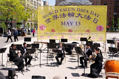 上午十点,祥和的炼功音乐响起,学员们开始炼功。蓝天白云下,灿烂的阳光中,缓慢圆的法轮功功法,非常的平和美好。之后,学员们表演了多个西洋管弦乐演奏,还有中国传统乐器二胡、琵琶、葫芦丝等的独奏和合奏,男女生独唱等,美妙的乐声在联合广场上空飘扬,表达着学员们对大法和师尊的感恩。