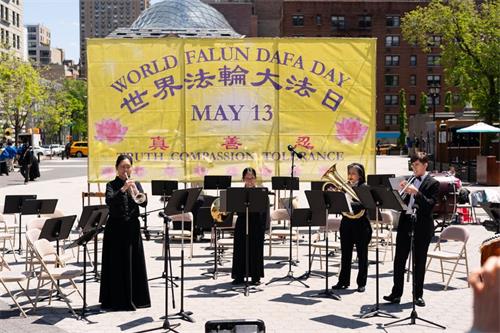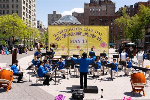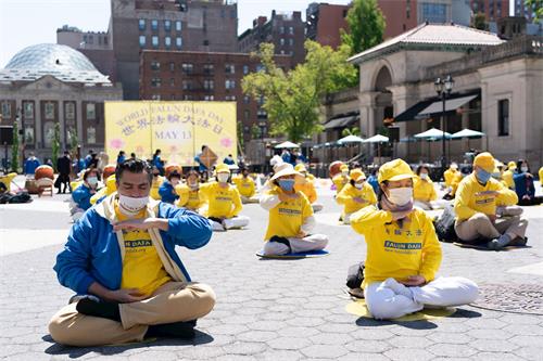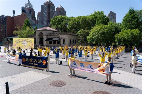 图1:五月十一日,纽约部份法轮功学员在纽约市中心联合广场欢庆世界法轮大法日,纽约州政要褒奖法轮大法。