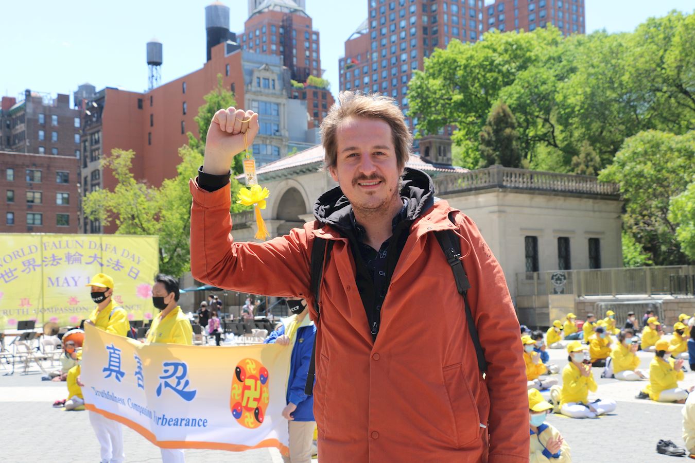 图14:纽约加拿大裔画商丹尼尔刚刚学炼法轮功,旧伤就被治愈了,特地前来联合广场参加庆祝法轮大法日。