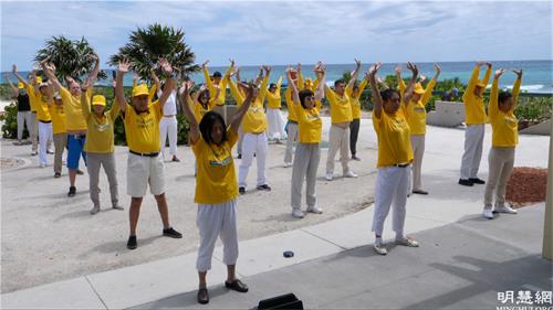 在节日般的氛围下,身着黄色丅恤衫的法轮功学员,随着炼功音乐向游人展示五套功法。他们缓慢优美的动作,与周围的海滨景色构成了一道特殊的风景,吸引了众多游人的注意,人们纷纷拿出相机,或拍照,或录像,记录下这优美的一刻,并主动与法轮功学员交谈。