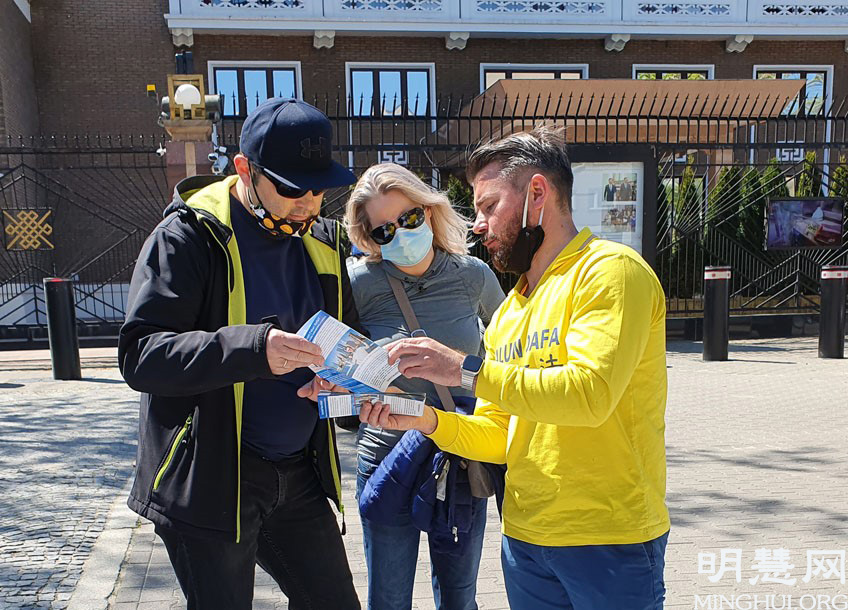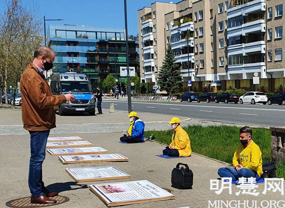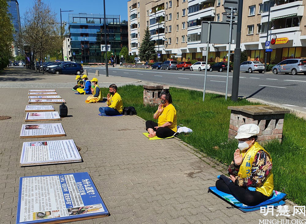 法轮功学员在集体学法后,首先来到华沙中使馆前静坐,抗议中共迫害法轮功。中使馆前路过的民众一拨又一拨的驻足观看法轮功展板,接过真相传单,有人拍照展板内容,有人现场手机上网了解更多资讯,也不断有人伸出大拇指,赞颂法轮功学员不畏中共的精神和道德勇气。
