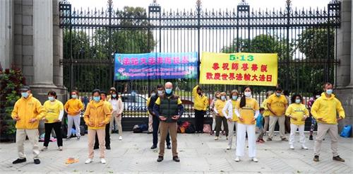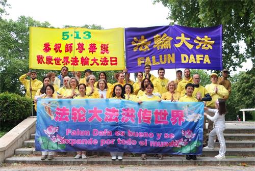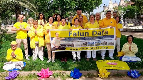 '图4~5:庆贺法轮大法日,部份西班牙学员集体炼功洪法'