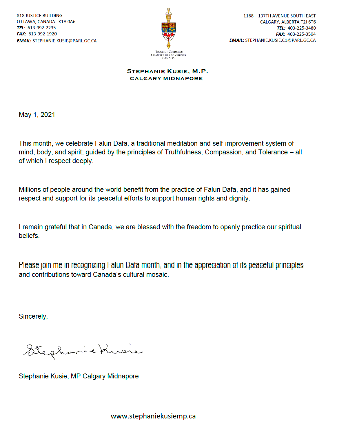 卡尔加里Midnapore选区国会议员、影子内阁交通部长Stephanie Kusie表达了对法轮大法的尊敬,“法轮大法是以真善忍原则为指导,提升身、心、灵的传统修炼方法,我对此有着深深的敬意。全世界有上千万人因修炼法轮大法而受益,其对人权和人的尊严所做的和平努力也受到尊敬与支持。请与我一起褒奖法轮大法月,感谢法轮大法和平的原则和为加拿大的多元文化所作的贡献。”
