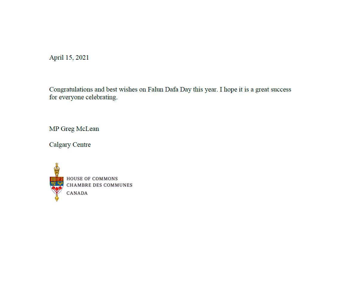 卡尔加里中区国会议员Greg McClean祝贺法轮大法日,“祝贺今天的法轮大法日,并致以最美好的祝愿。祝你们的庆祝活动大获成功。”