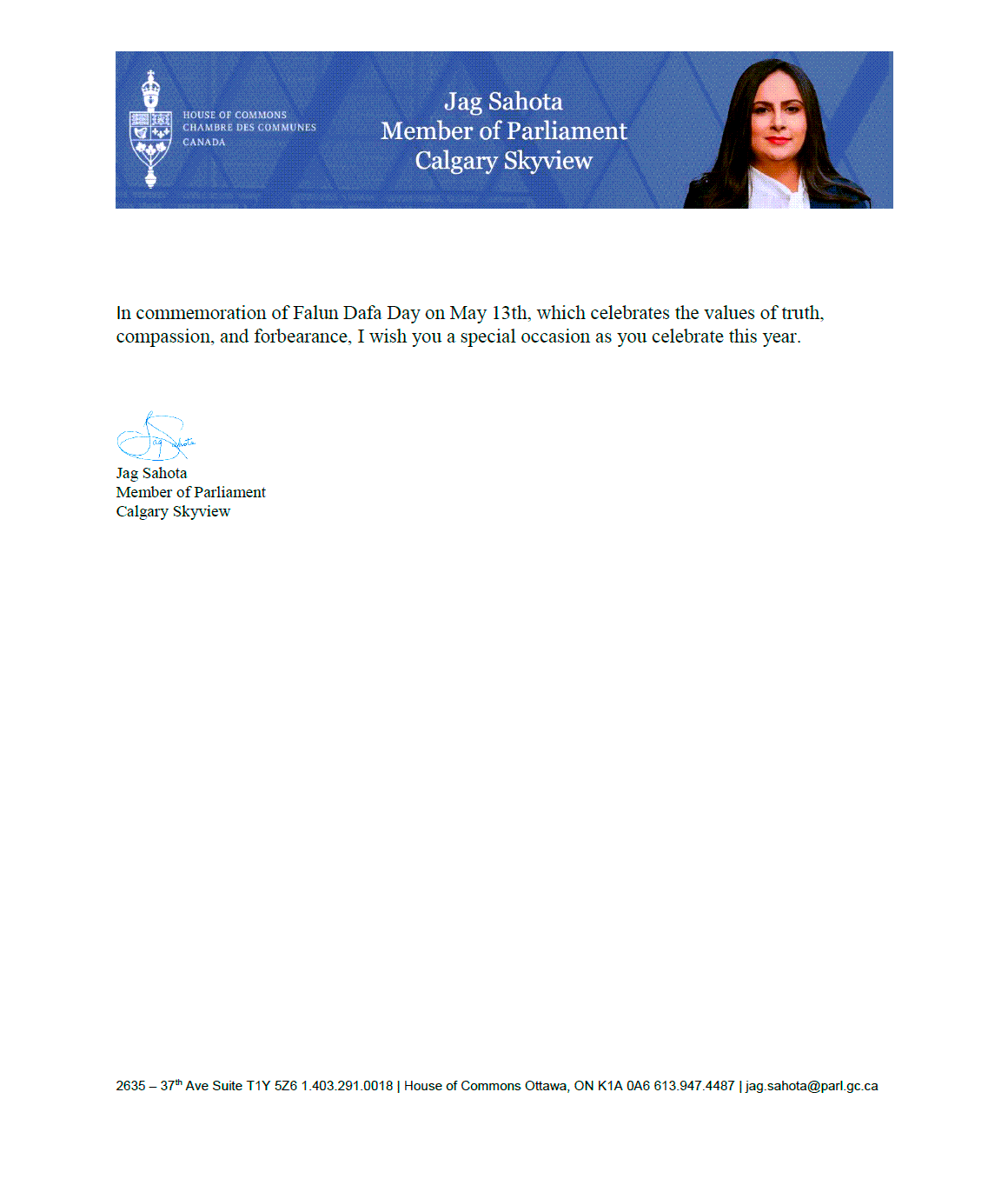 卡尔加里Skyview选区国会议员、影子内阁妇女与性别平等部长Jag Sahota同样发来祝贺,“在颂扬真、善、忍价值观的法轮大法日,祝你们的庆典成为一个特殊的盛会。”