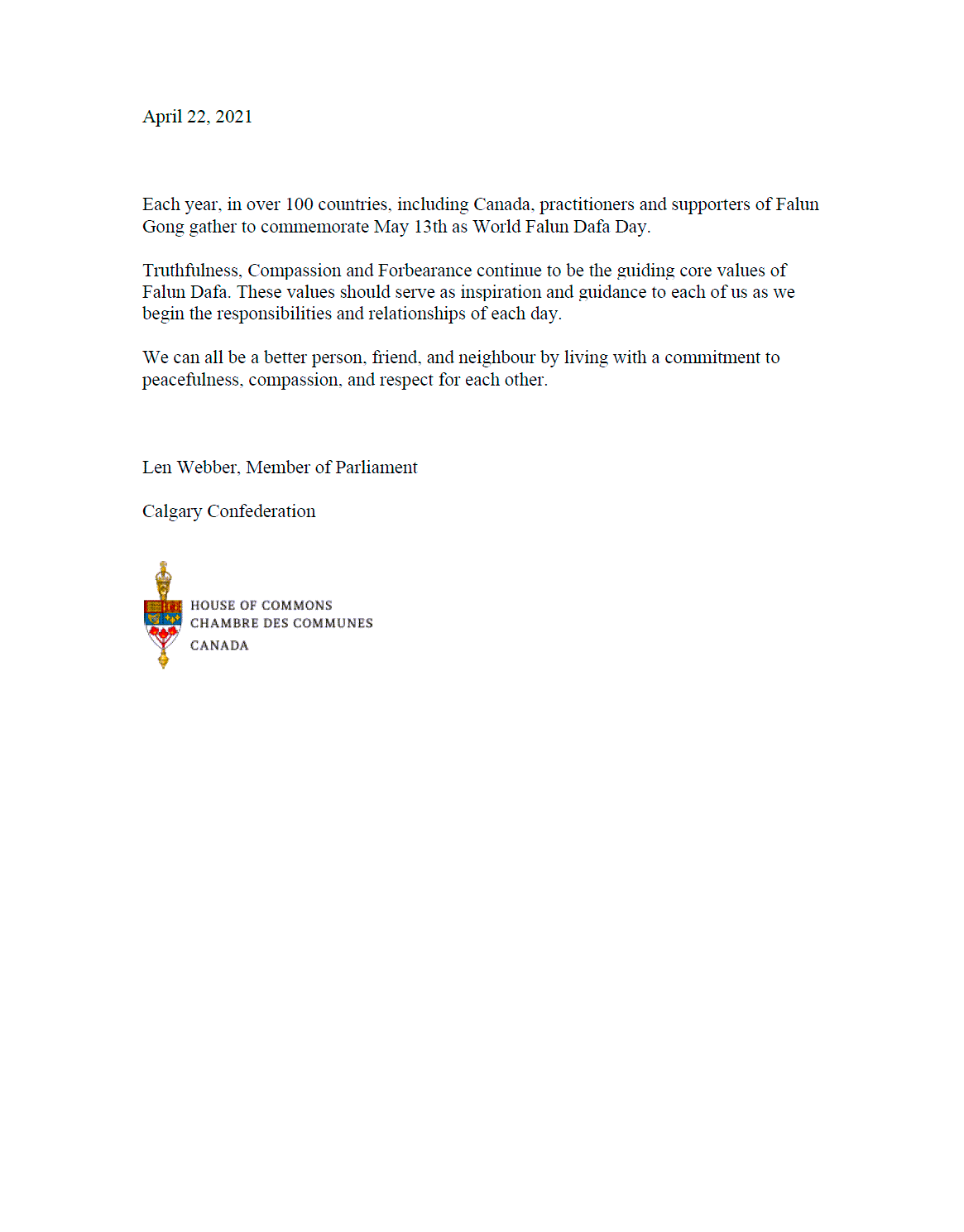 卡尔加里Confederation选区国会议员Len Webber赞誉法轮大法的原则,“真、善、忍始终是法轮大法的指导原则,这些原则应作为我们每个人每天在人际交往中的准则。实践和平、善良与彼此尊重,我们每个人都能成为一个更好的人、更好的朋友、更好的邻居。”