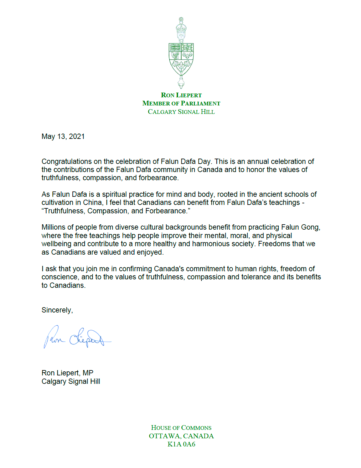 图12:卡尔加里Signal Hill选区国会议员Ron Liepert的贺信