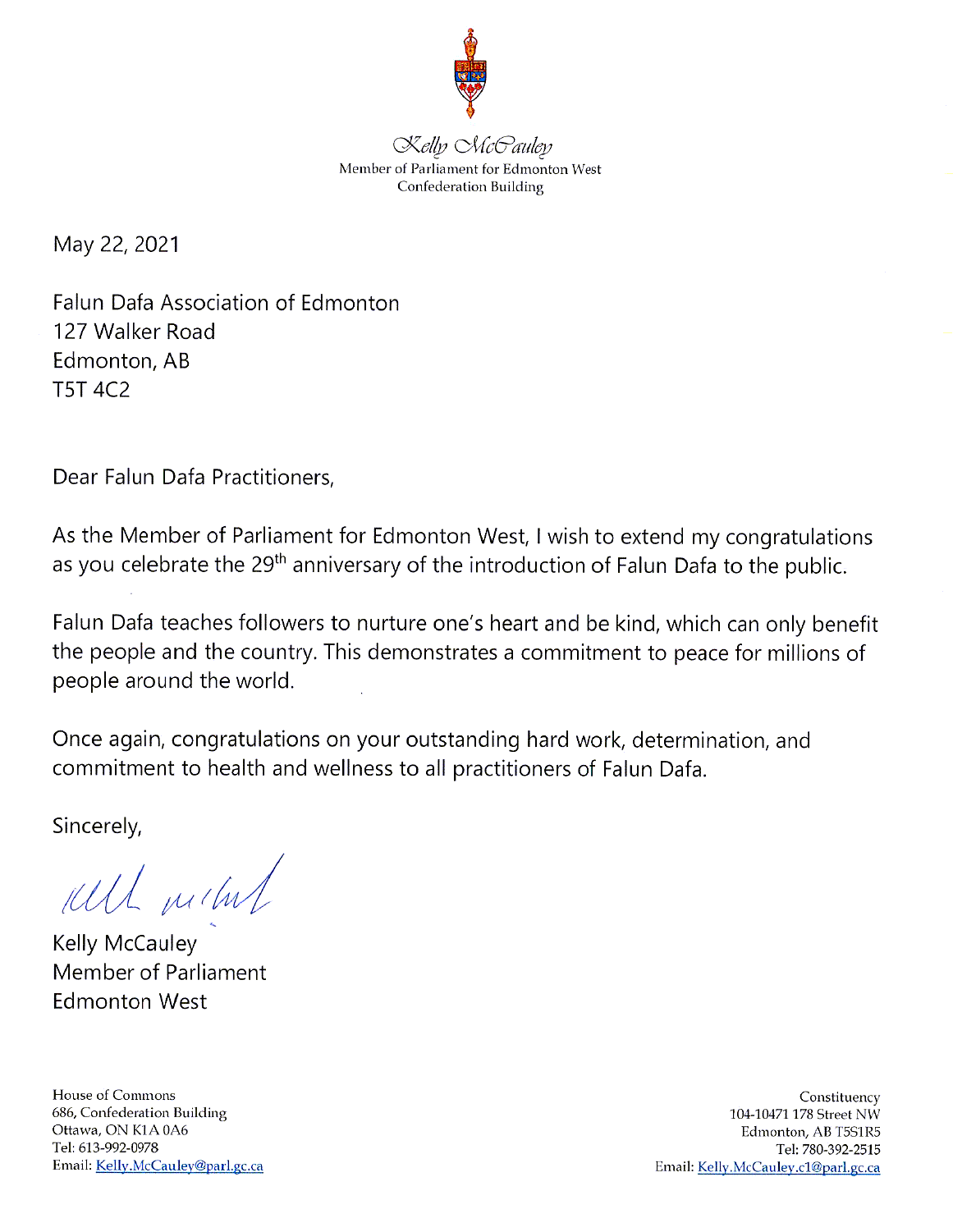 图14:埃德蒙顿西区国会议员Kelly McCauley的贺信