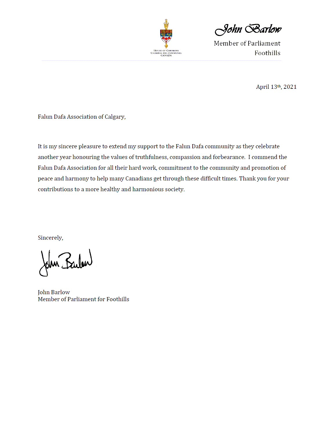 Foothills选区国会议员John Barlow赞扬法轮大法在人类艰难时刻所做的贡献,“我赞扬法轮大法学会为促进和平与和谐,帮助众多加拿大人度过这些艰难时期所作的努力和付出,感谢你们对提升社会健康和睦所作的贡献。”