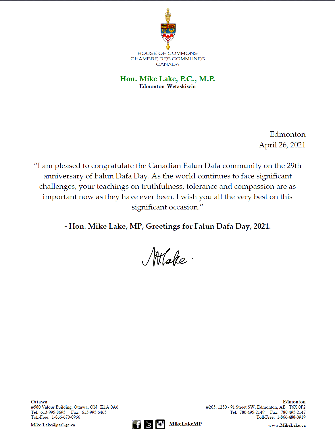 埃德蒙顿Wetaskiwin选区国会议员Mike Lake向加拿大法轮大法团体致以祝贺,“向你们致以最美好的祝愿”。他表示,“在全世界继续面临严峻挑战之时,法轮大法教导的真、善、忍原则一如既往地重要。”