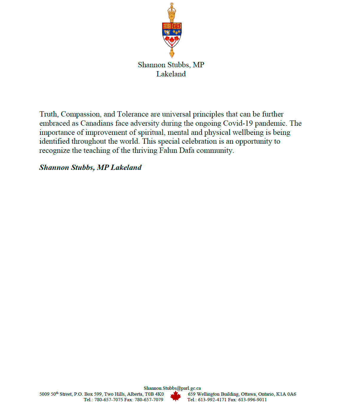 Lakeland选区国会议员、公共安全官方反对党评论家Shannon Stubbs盛赞法轮大法的准则在现时形势下的重要性,“真、善、忍是普世原则,值得加拿大人在当今面对病毒大流行的困境中进一步遵循,提升心灵、精神和身体健康的重要性在全世界受到普遍认同。”