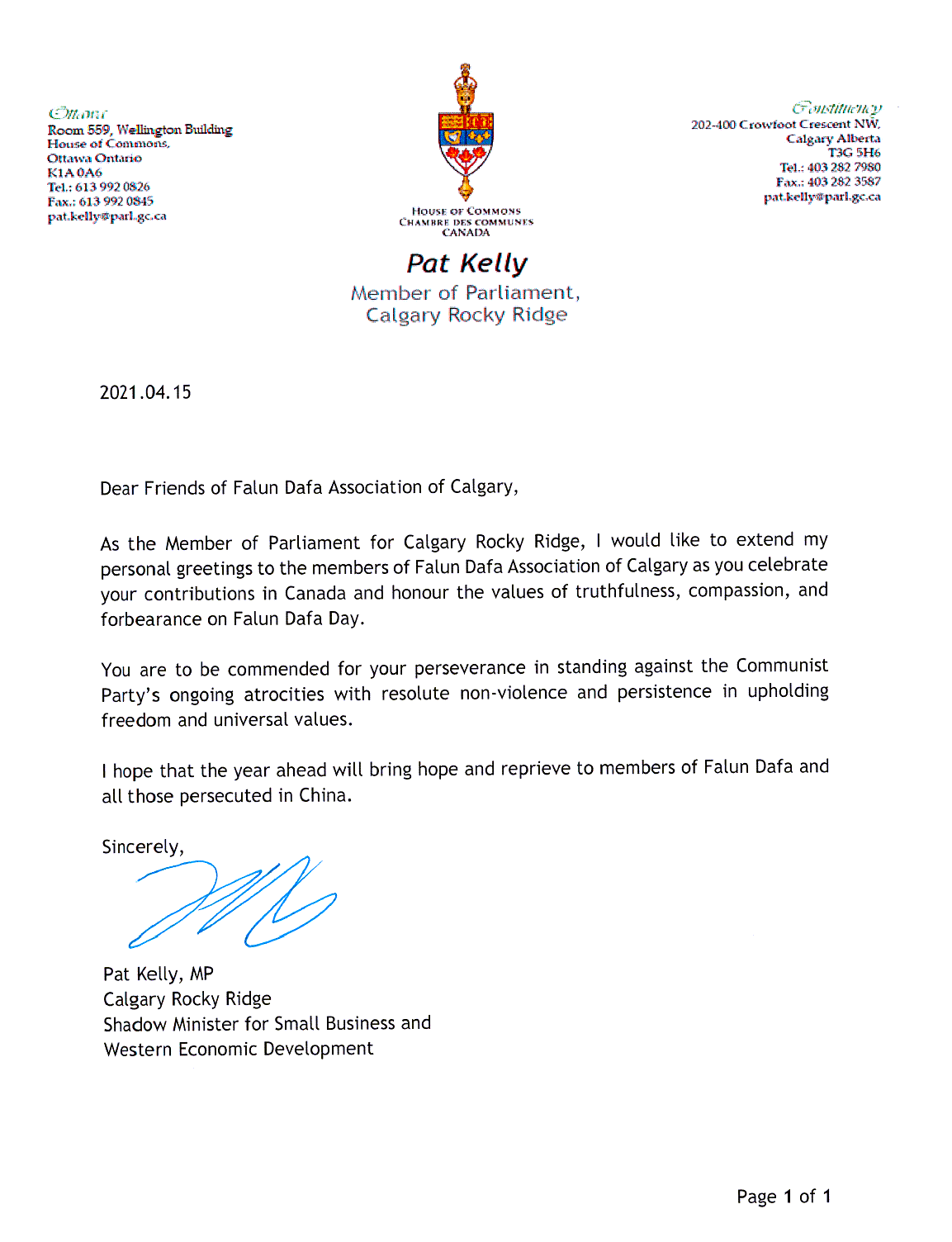 图23:卡尔加里RockyRidge选区国会议员Pat Kelly的贺信