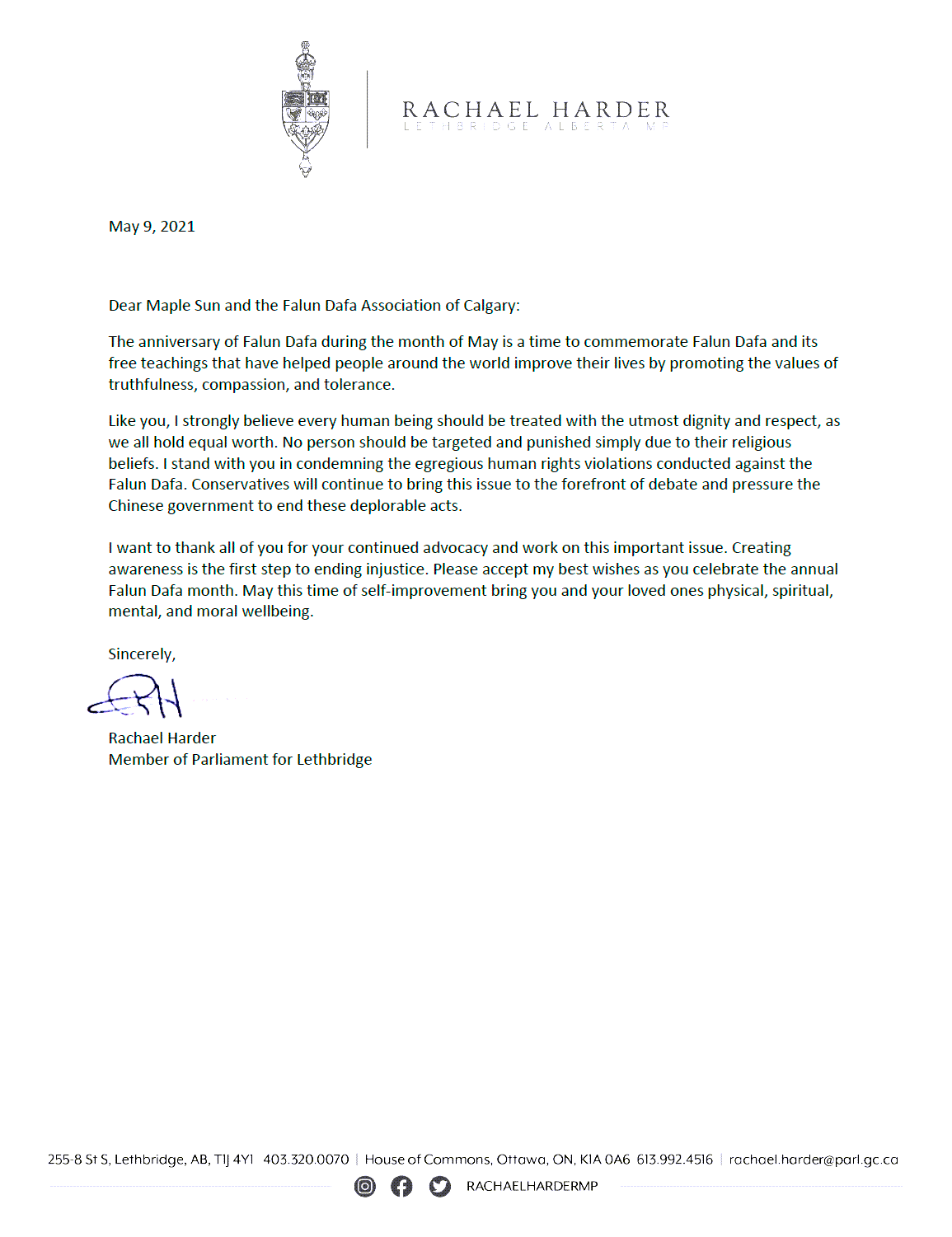 Lethbridge选区国会议员Racheal Harder为法轮大法日献上“最诚挚”的祝福,并谴责中共对法轮功的迫害,“与你们一样,我坚信每个人都应该拥有尊严,被尊敬,被平等对待,人不应该仅仅因为宗教信仰而被迫害。我与你们一同谴责对法轮大法的令人发指的人权迫害。保守党将一如既往地将此事摆上议程,并施压中共政府停止其恶劣行径。我感谢你们继续为这个重要问题发声出力。”