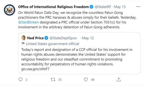 美国国务院国际宗教自由办公室在推文中说,“值此世界法轮大法日,我们确认有无数的法轮功学员仅仅因为自己的信仰而在中国受到中共的骚扰和虐待。”