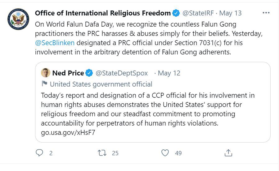 推文说,“昨天,国务卿布林肯根据《外国行动及相关计划拨款法》第7031(c)条规定,对中共官员(原610办公室主任余辉)进行制裁,因他参与了对法轮功学员的任意关押。”