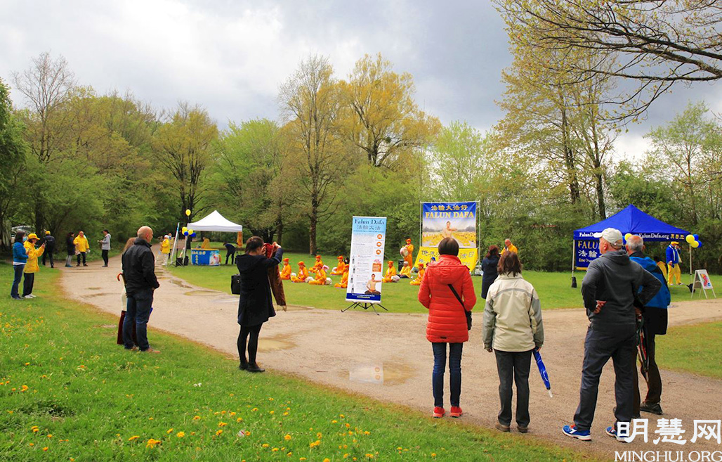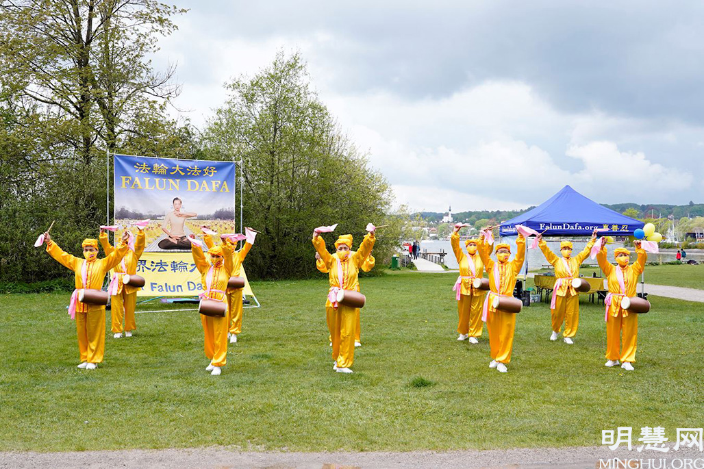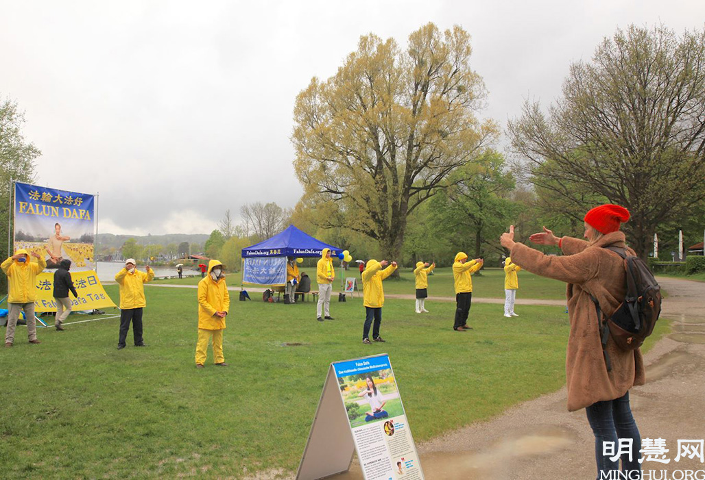 斯坦伯格湖(Starnberger See)位于慕尼黑西侧,大慕尼黑地区著名的高档社区。法轮功学员的庆祝活动吸引了不少在湖边散步民众的目光,特别是学员们祥和的功法演示和喜庆的腰鼓表演,舒缓了在中共病毒压抑下人们的情绪。在了解到真、善、忍的意义后,很多人表示希望学炼法轮功。当天不时下阵雨,有民众看到学员在雨中坚持很感动,不少人签名声援法轮功学员反迫害。