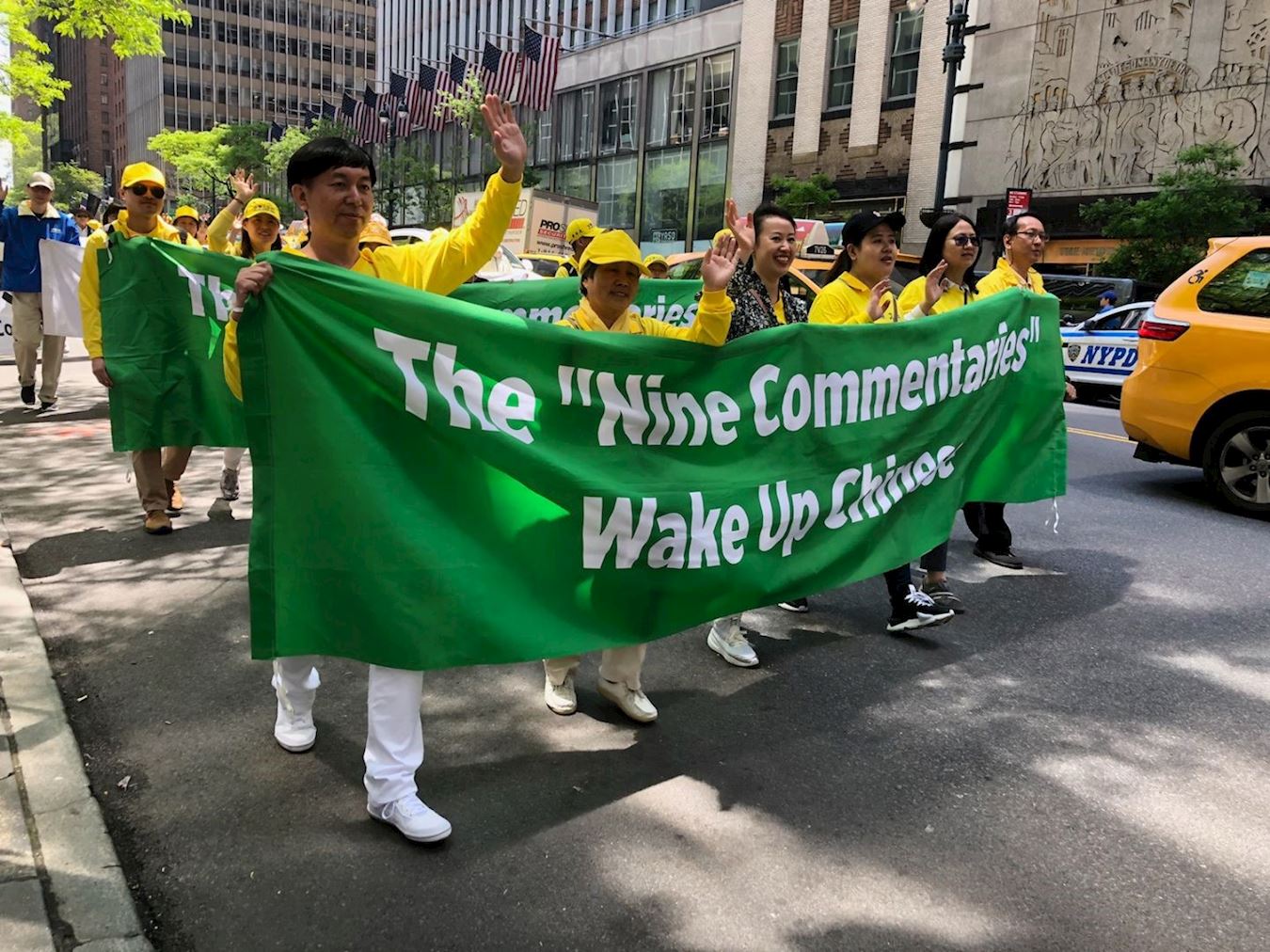 ![]() 图2:法轮功学员王欣(左一)二零一九年参加纽约法轮大法游行。 |