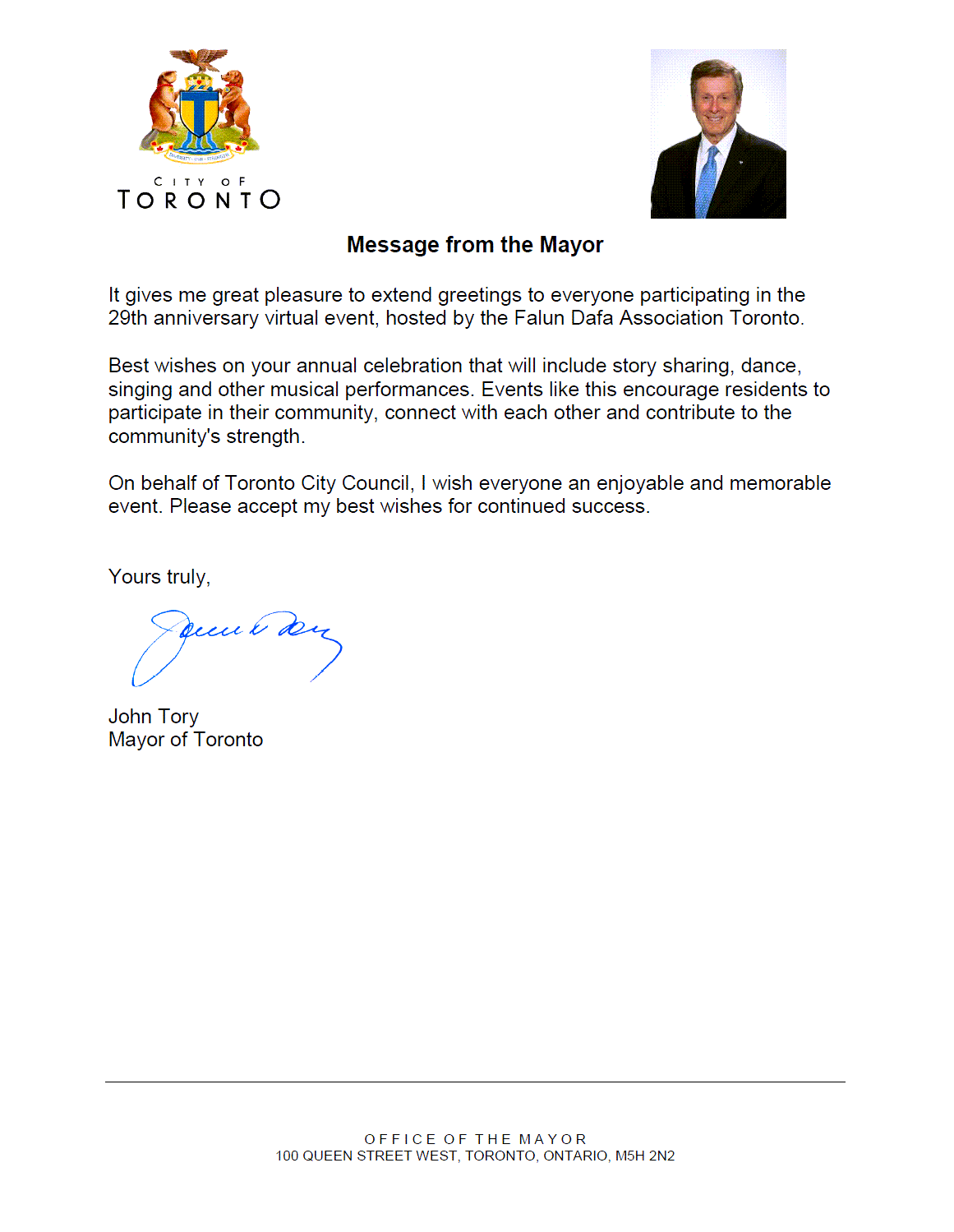 多伦多市市长约翰·托里(John Tory)在贺信中写道:我很高兴向参加多伦多法轮大法学会主办的29周年庆祝活动的每一位成员致以问候。
