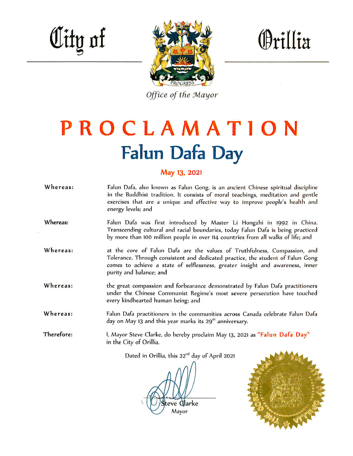 我,市长史蒂夫·克拉克(Steve Clarke),特此宣告2021年5月13日为奥里利亚市的法轮大法日。